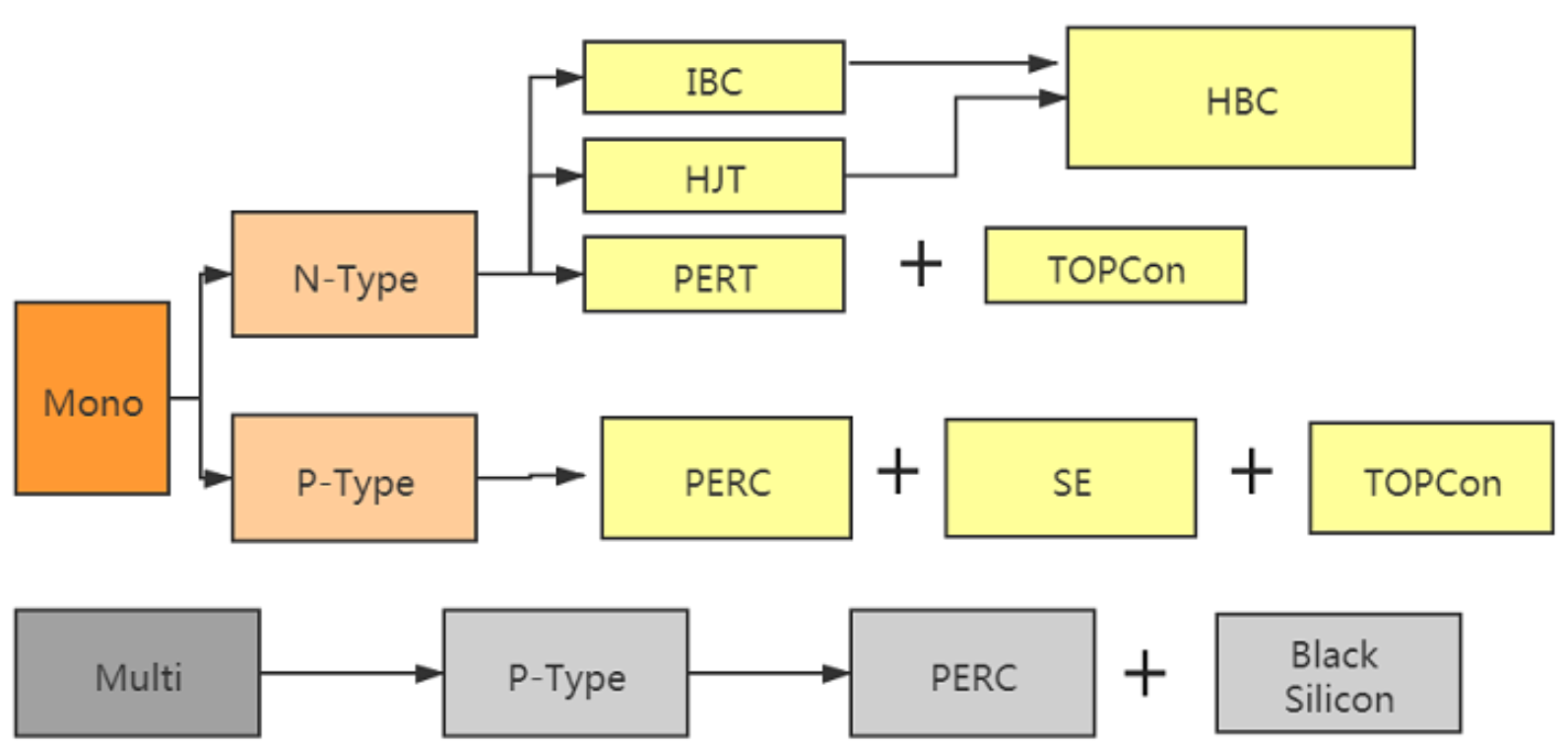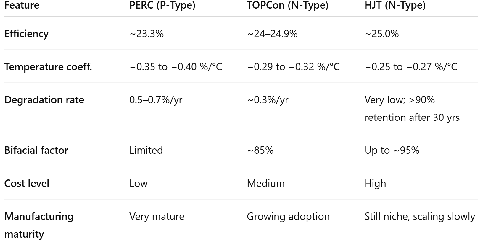 TOPCon: the “middle ground” solution. High efficiency (24–25%), low degradation, and lower costs compared to HJT.