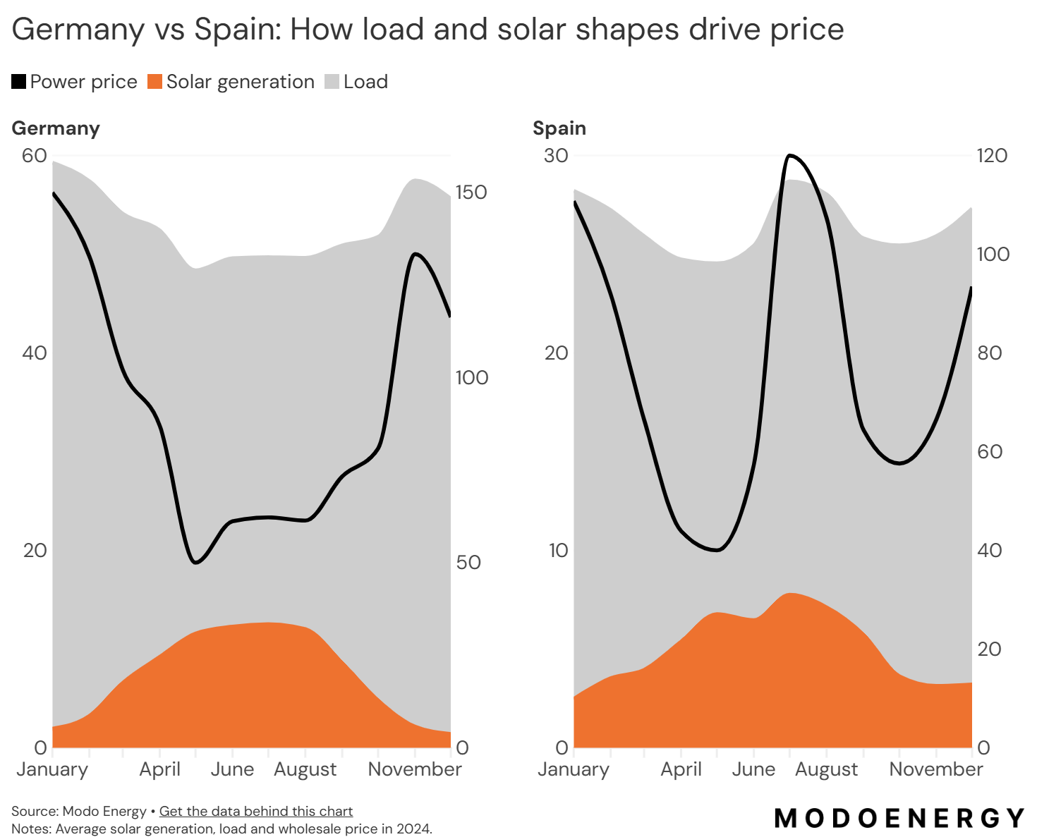 Spain covers 18% of its demand with solar energy, while Germany only 10%. Even so, capture rates are almost identical. The difference lies in seasonality and demand patterns: