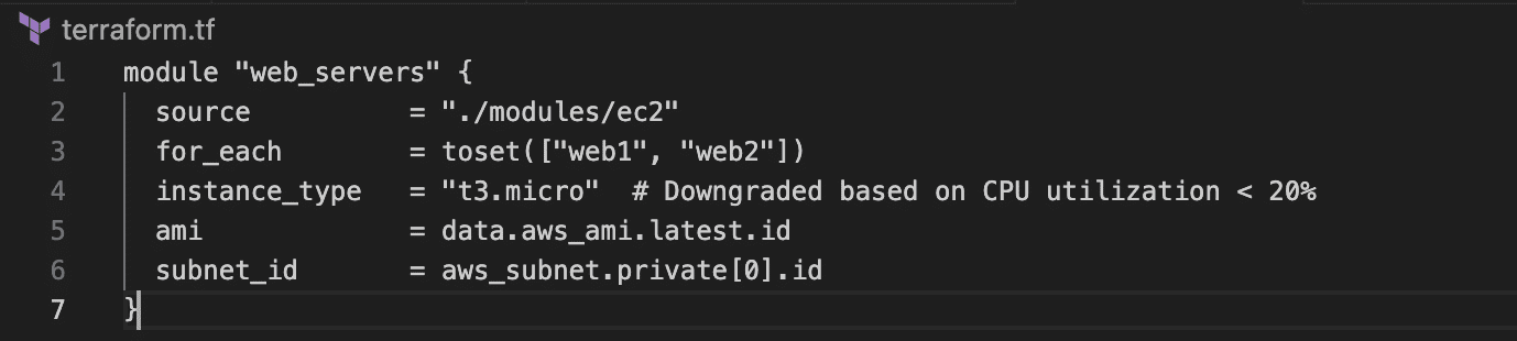 Instead of repeated blocks, AI can propose a single parameterized module using for_each across environments, keeping tagging, versions, and instance types consistent. In multi-account setups, AI enforces uniform tagging and module versions.