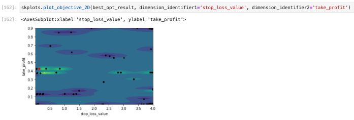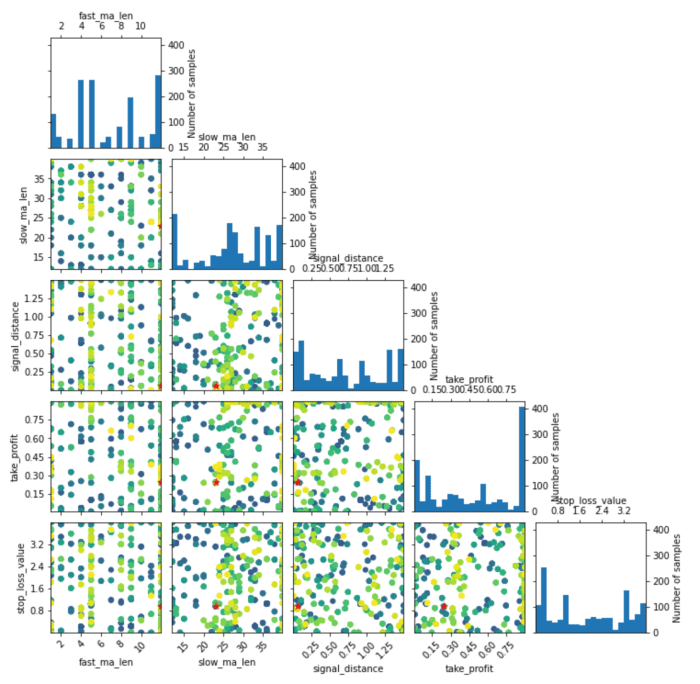 After you’ve run the optimizer for some time you can visualize the search space. A very useful visualization is to take a pair of parameters to see in two dimensions the best values, looking for ranges of values which are worth exploring more or obviously devoid of profitable inputs. You can use this information to adjust the ranges on the input domains.