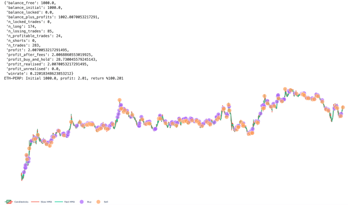 slow_ma_len and fast_ma_len have distinct steps in their inputs vs. the more “messy” real number inputs.After running the optimizer for a few hundred or thousand iterations it spits out the best inputs. You can then visualize the buying and selling the bot performed during backtesting. This is a good time to sanity-check the strategy and see if it appears to be buying low and selling high.