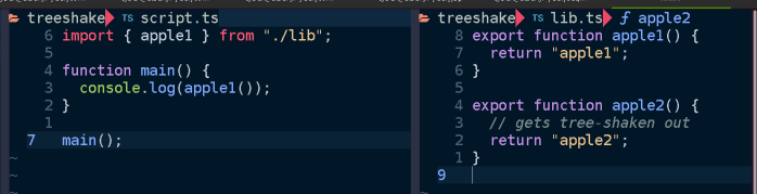 By way of illustration, suppose we have a script that imports a function from a library. Here it calls apple1() from lib.ts: