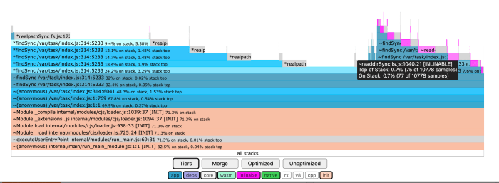 Another way to get an idea of what your node bundle is actually doing at startup is to profile it. I really like the 0x tool which can run a node script and give you a flame graph of where CPU time is spent. This can be an informative visualization and let you dig into what is being called when your script runs: