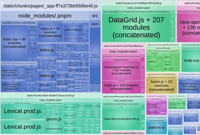 With duplicate modules out of the way, the main meat of the report is the bundled modules. This will usually be broken up into your code and stuff from node_modules: