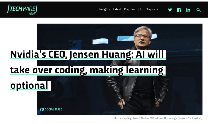 Based Jensen Huang, CEO of Nvidia, which is one of the largest companies in the world by market cap now, said this February that people should stop learning to code. He was making the point that people will soon be able to instruct computers with natural human language to get what they want out of them. If you’re a younger person or a parent, it’s worth asking now, is there still value in learning to program a computer or get a computer science education?