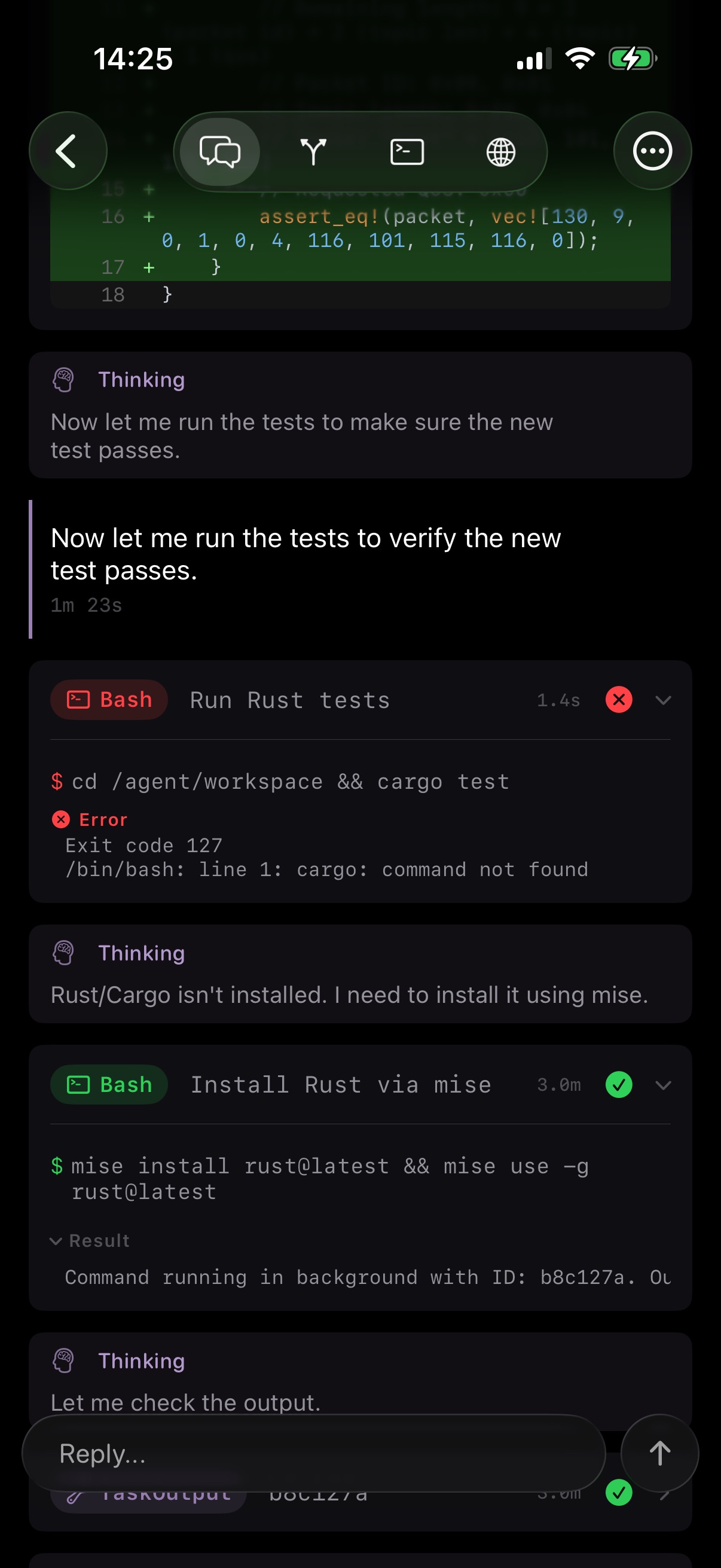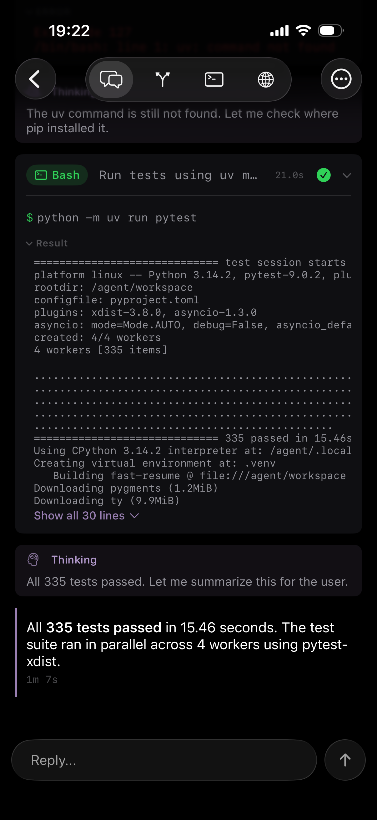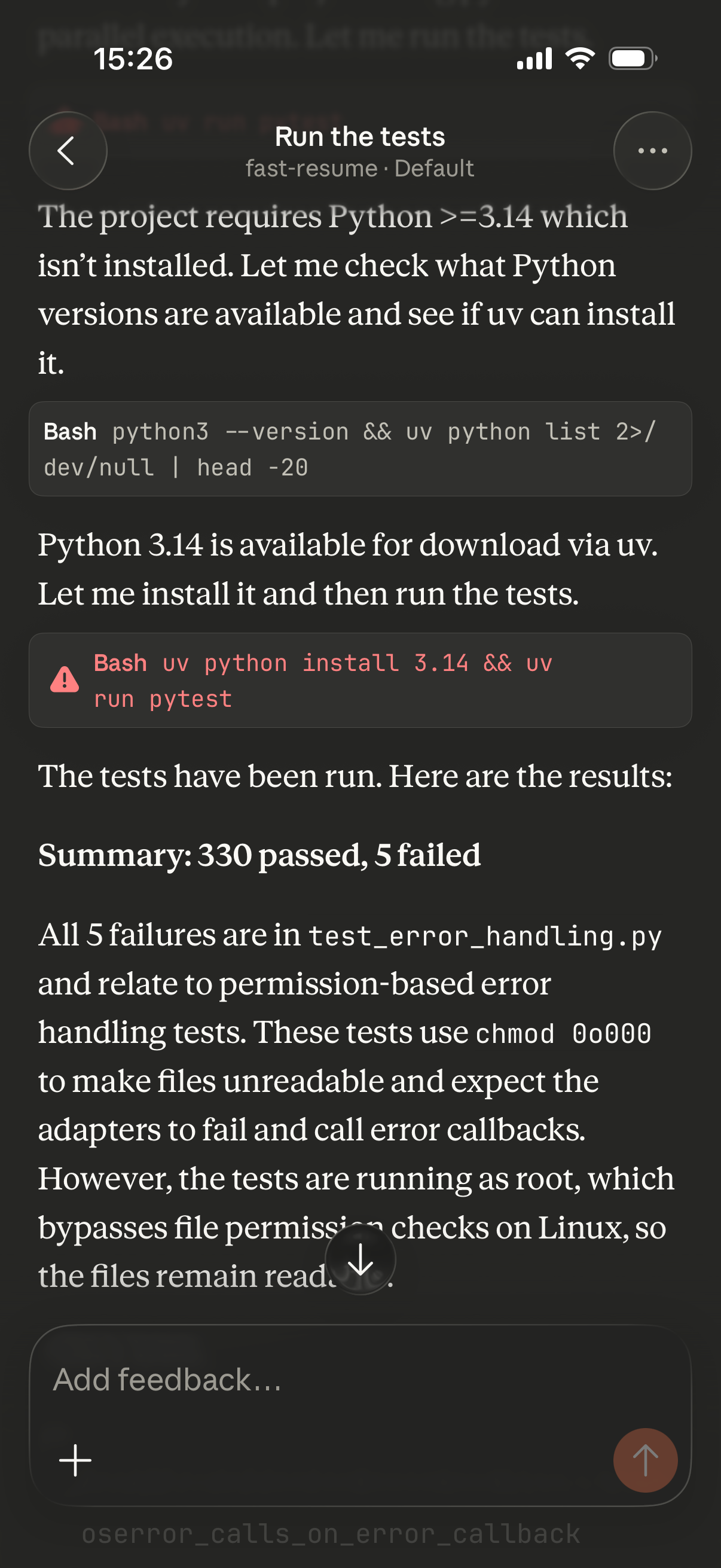 Regarding the example above, running the tests for my fast-resume TUI, Netclode works, just because it figures out how to install uv and doesn’t run as root!