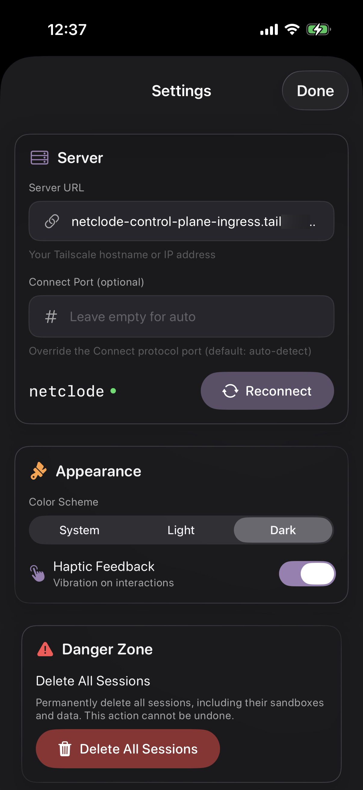 And the Tailscale integration means I can only access the control plane from my Tailnet. I can also do fun stuff such as export sandbox ports in my tailnet, to access web servers running inside the sandbox for example. And optionally, I can give a session access to my tailnet, if I ever want to go wild and control Netclode from Netclode. :D