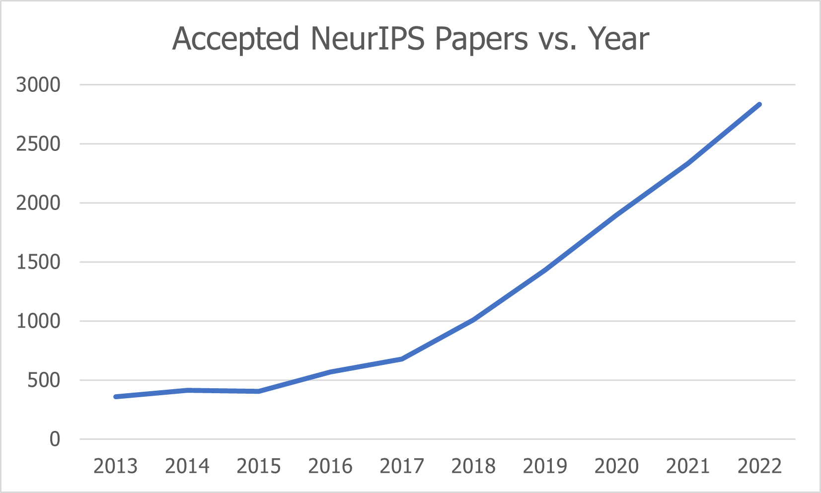 I first catalogued all NeurIPS papers indexed in Semantic Scholar, allowing me to chart out how many papers were published per year.