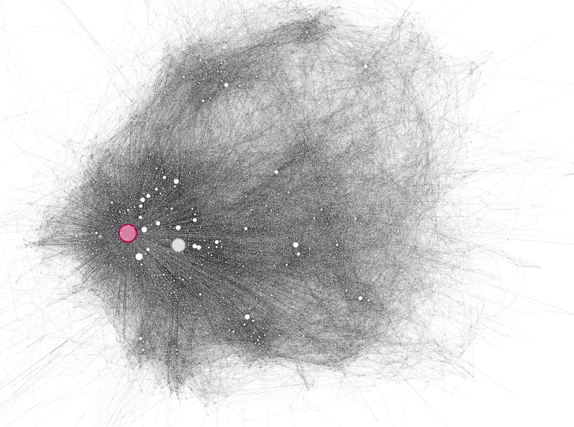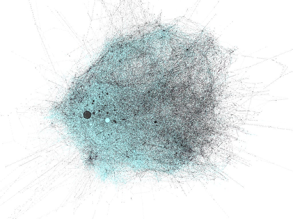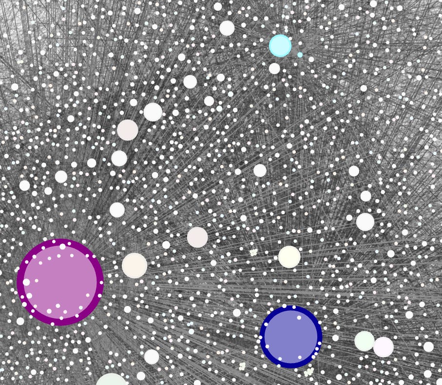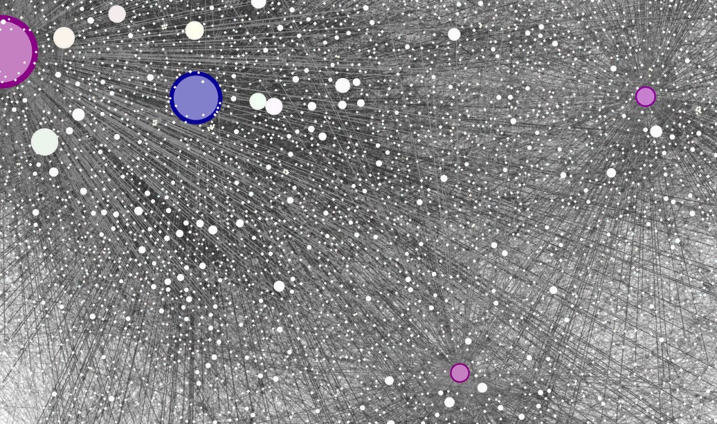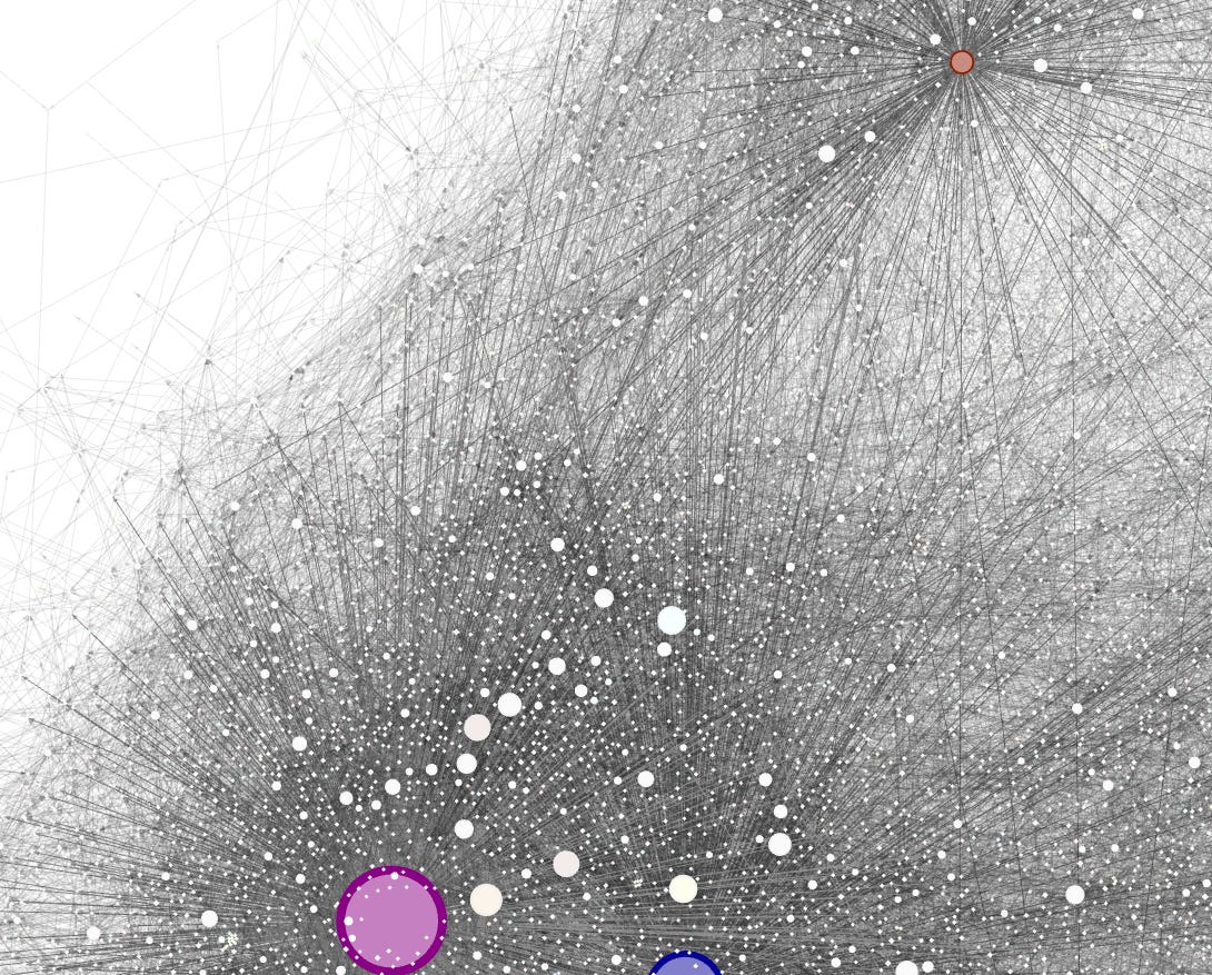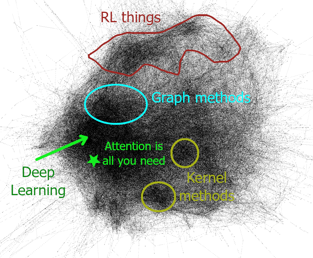 I then spent two nights hammering the Semantic Scholar citations API, allowing me to retrieve a mostly accurate* picture of each paper’s references. I turned these references into a huge edge list (published here, see note on inaccuracies below) and ran Gephi’s graph edge visualizer to produce the beautiful image above. Immediately I was struck by the substructure apparent in the ForceAtlas layout of the graph and went to investigate further—this is going to be a picture-heavy post.