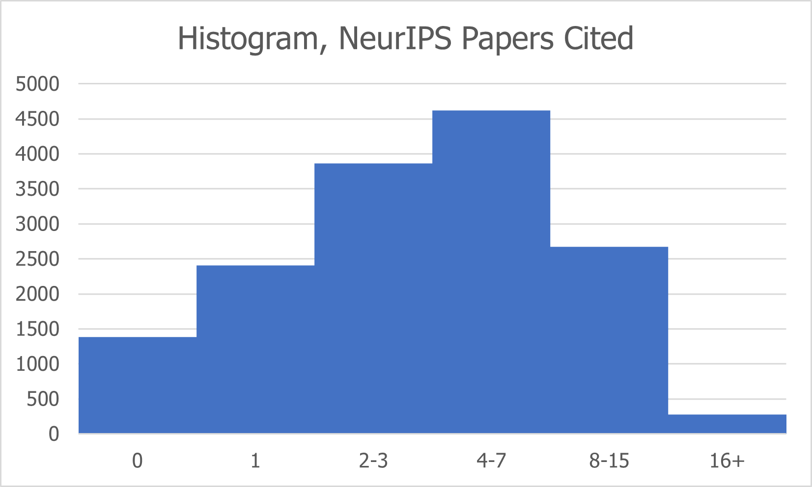 For a brief sanity check I showed the distribution of the number of NeurIPS papers cited by each NeurIPS paper. These skew on the lower end, with about half the papers citing less than four other papers from previous conference proceedings.
