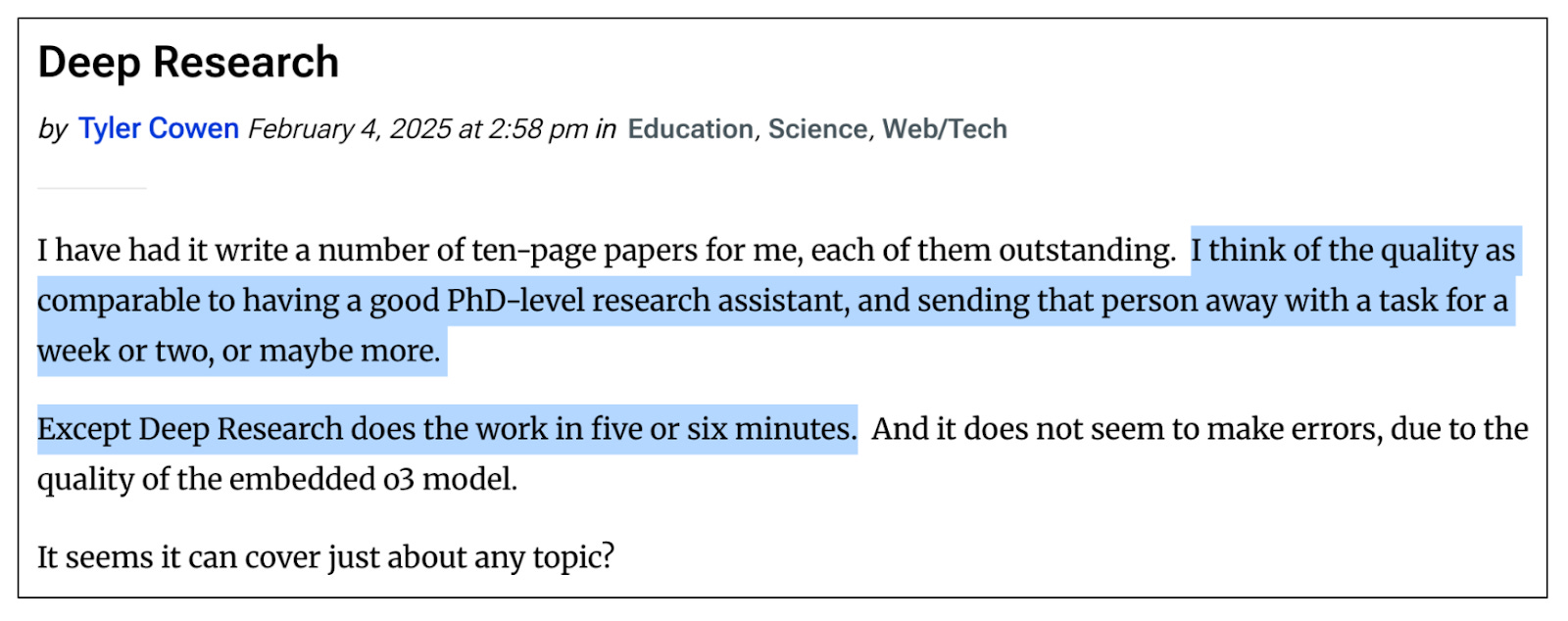 Consider, too, that AI companies are targeting the abilities of the very best in the world at a subject. One way to think of this is that, if AI is ‘just predicting the next word,’ it will soon be predicting the next word of basically the most capable person you know.