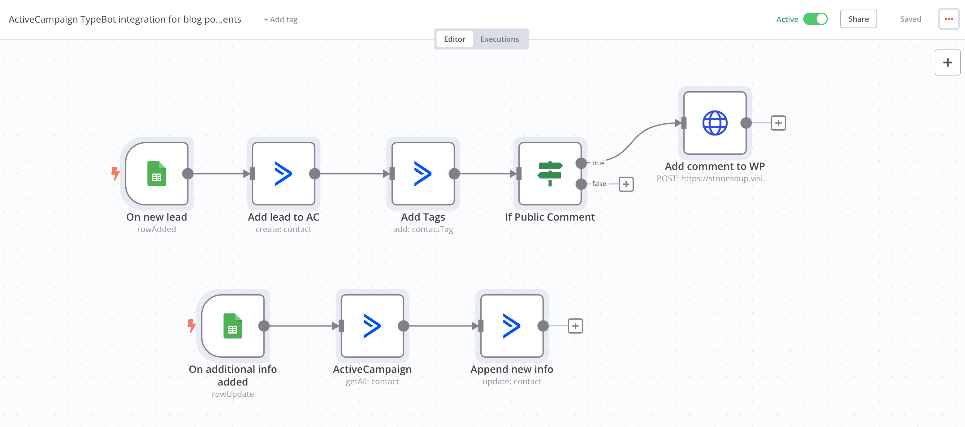 We’re going to go section-by-section here and by the end you should have the exact same setup as I do below. Note: these instructions are with WordPress as the CMS, TypeBot as the chatbot service and ActiveCampaign as the CRM but you could just as easily swap out a different CMS, CRM and/or chatbot service. The overall setup will be the same. I’m using Google Sheets as an intermediate repository and n8n as the middleware which has support for a number of different systems so the general framework here can be modified for any permutation of tools to get the same result. Let’s dig in.
