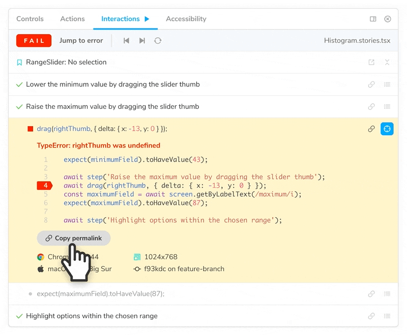Use playback controls to observe the intermediate states between steps. Or replay all the story’s steps to double check that interaction tests work as expected.