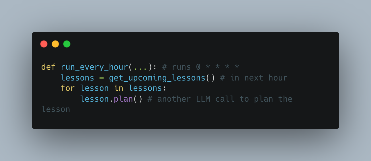 What if we made a beat schedule? For example, Orin needs to plan out lessons before they happen. We can beat every hour and check which lessons are coming up, then have another LLM plan them: