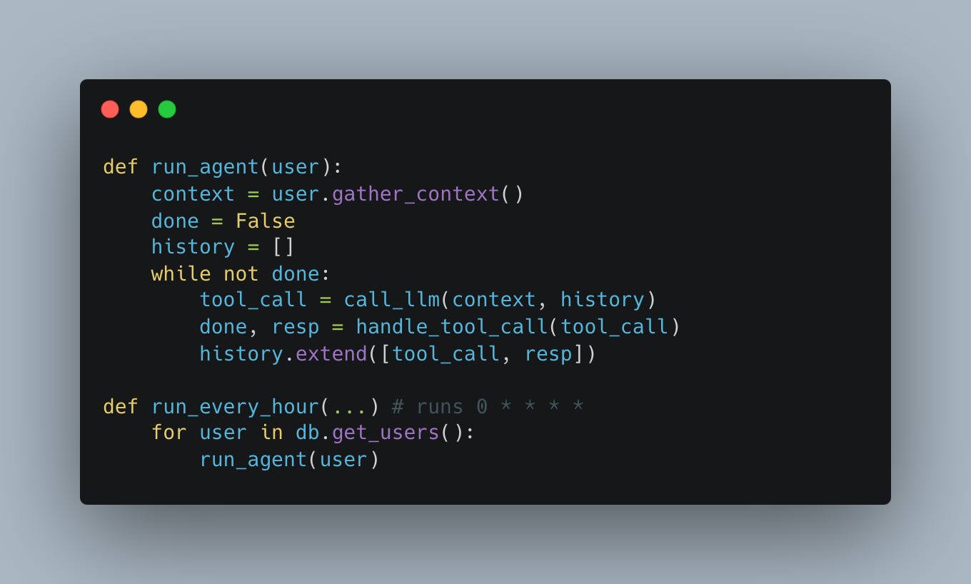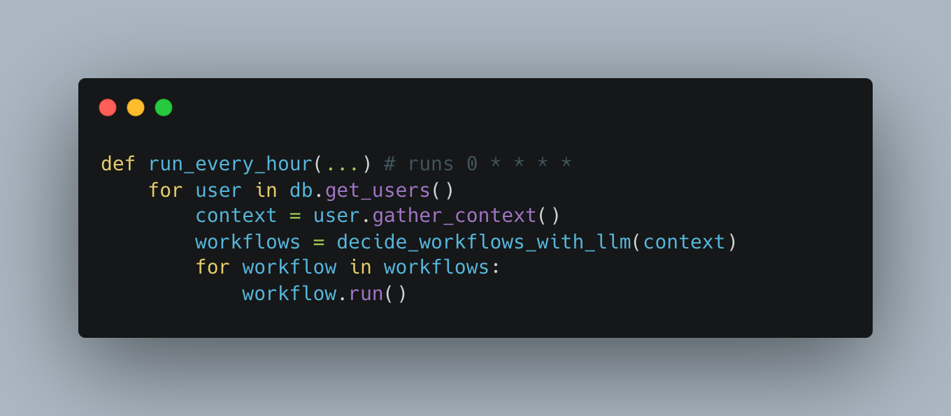 Now, Orin can decide when he wants to run, providing a completely dynamic experience for every user. He consumes minimal compute, can build his own workflows from his tools, and we can still wake him from user events.
