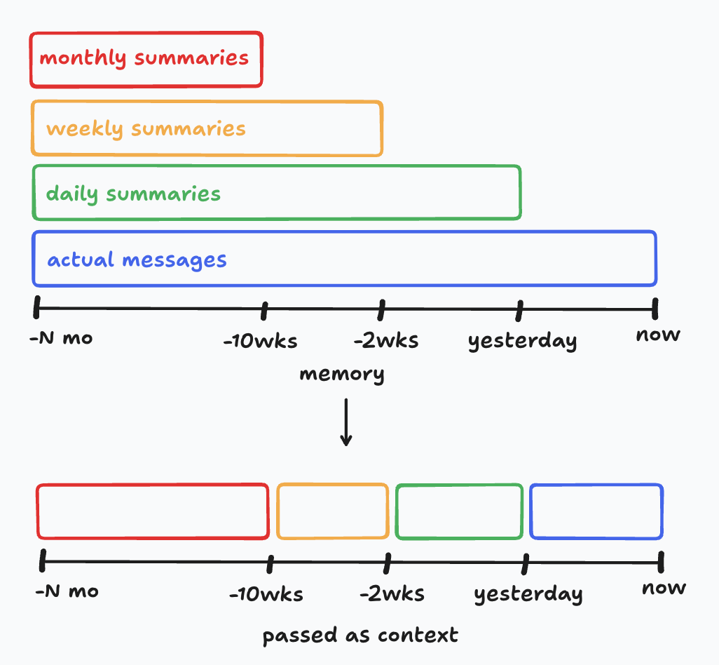 For Orin’s memory, we needed to be able to store varying degrees of resolution. For example, it’s totally fine if Orin can’t remember exact lessons plans from a year ago. Instead, he should remember big events in the student’s life (what were we studying for?), their progress from a year ago (what have they improved on?), and other similar facts.