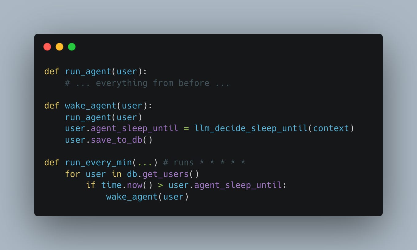 At the end of every workflow, what if we force the LLM to decide how long it should “sleep”? This way, the agent can manage its own schedule.