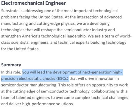 For reasons possibly related to the nepotism involved in the company’s creation, the founders do not know what they are hiring for. Their job postings, in fact, are entirely fake, and were created with an LLM that, seemingly, they asked to come up with roles for a foundry that is doing everything in-house. This has given way to genuinely funny job postings; for example, an electromechanical engineer whose job it is to design chucks.
