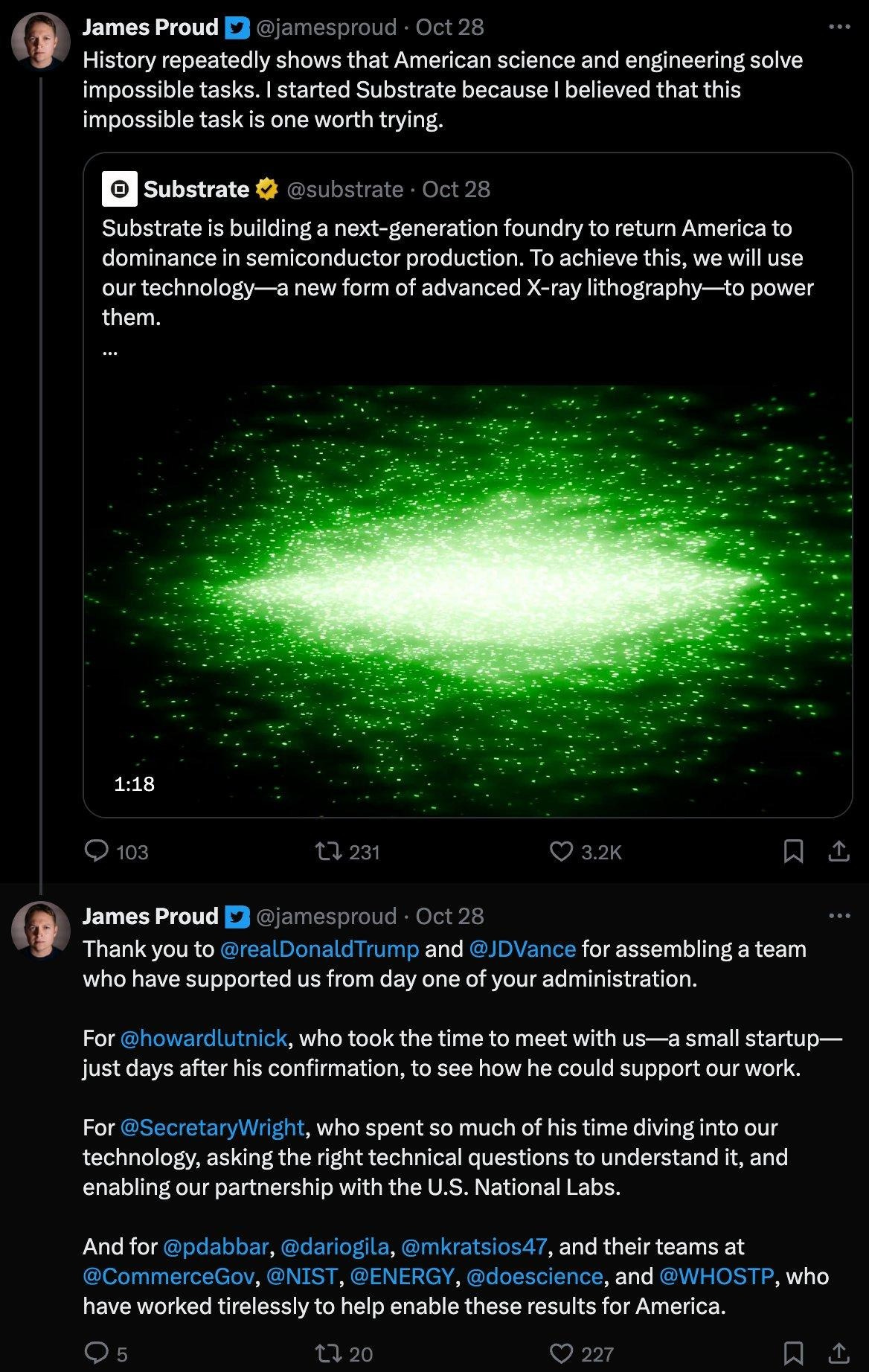 Would you believe that, with the best technology in the world, they are totally unwilling to share any concrete evidence of their technology’s existence with anyone? Substrate claims they will “reduce the cost of leading-edge silicon by an order of magnitude compared to the current cost-scaling path we are on. By the end of the decade, Substrate will produce wafers closer to $10,000, not $100,000.” This is a remarkable claim, but rather than evidence it, Substrate’s founder seems to point to his investors, American dynamism, and politicians for reasons to believe in the company.