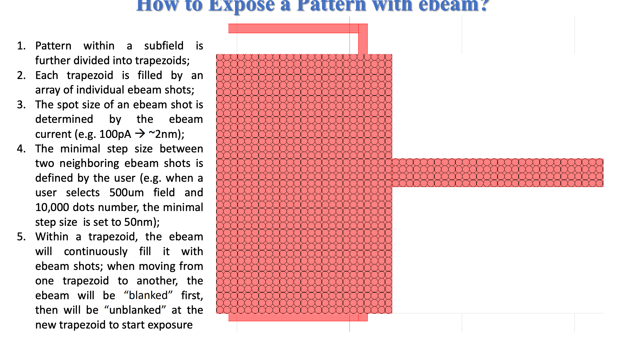 Well, in e-beam lithography (and with other direct writing methods, but e-beam is the best-documented), you have what are called write subfields, and in those, you can describe the shapes you want to see the machine write, where (not) to apply energy to the substrate, etc. You can imagine it like a printer where you have a fixed number of dots-per-inch. Spacing between lines can’t be that much smaller than the lines themselves.