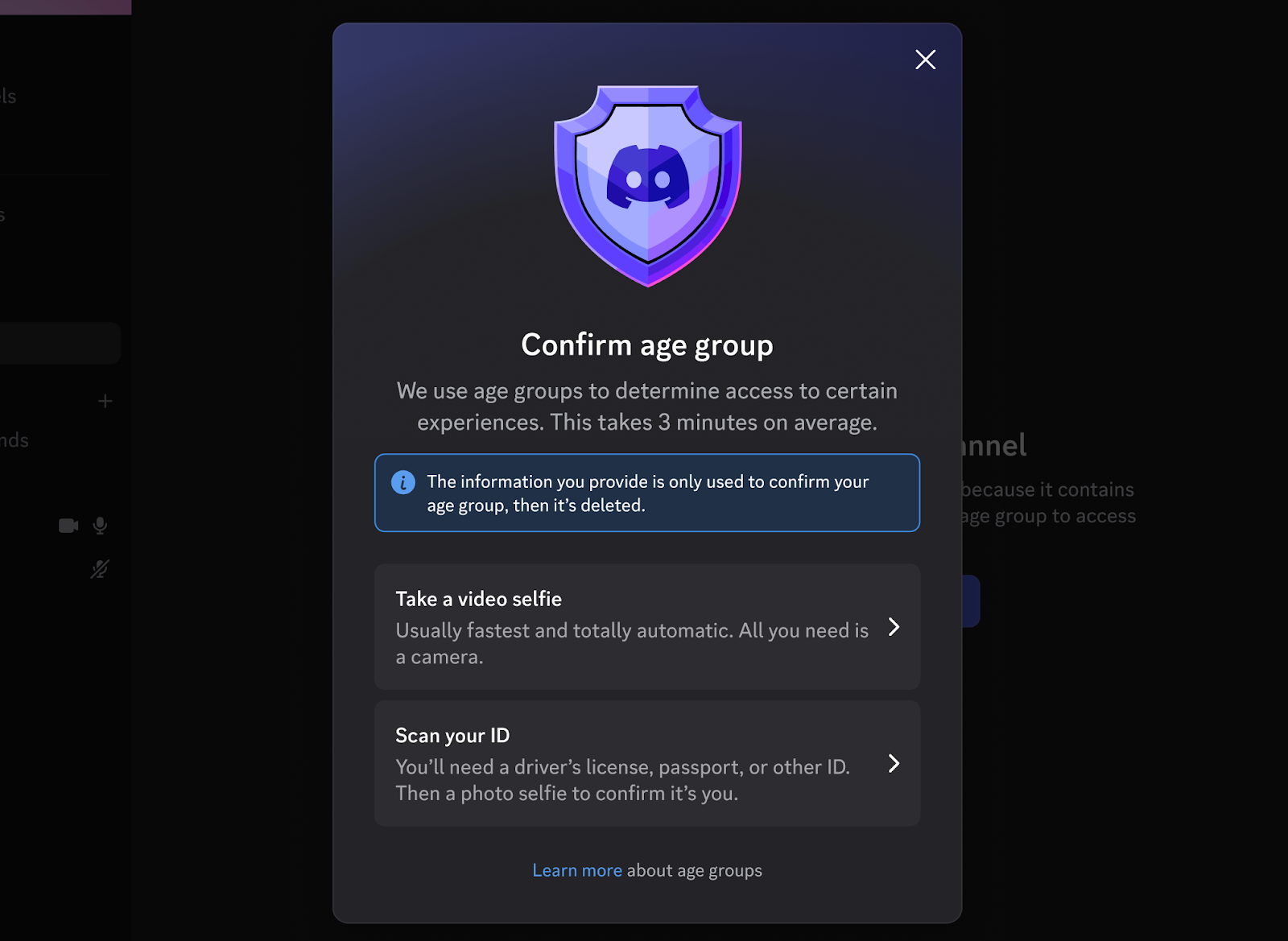 - Facial Age Estimation (Video Selfie): Uses your device's camera to estimate your age group. Processing happens entirely on your device — your video selfie never leaves it, and Discord and our vendor, k-ID, never receives it. We only receive your age group.