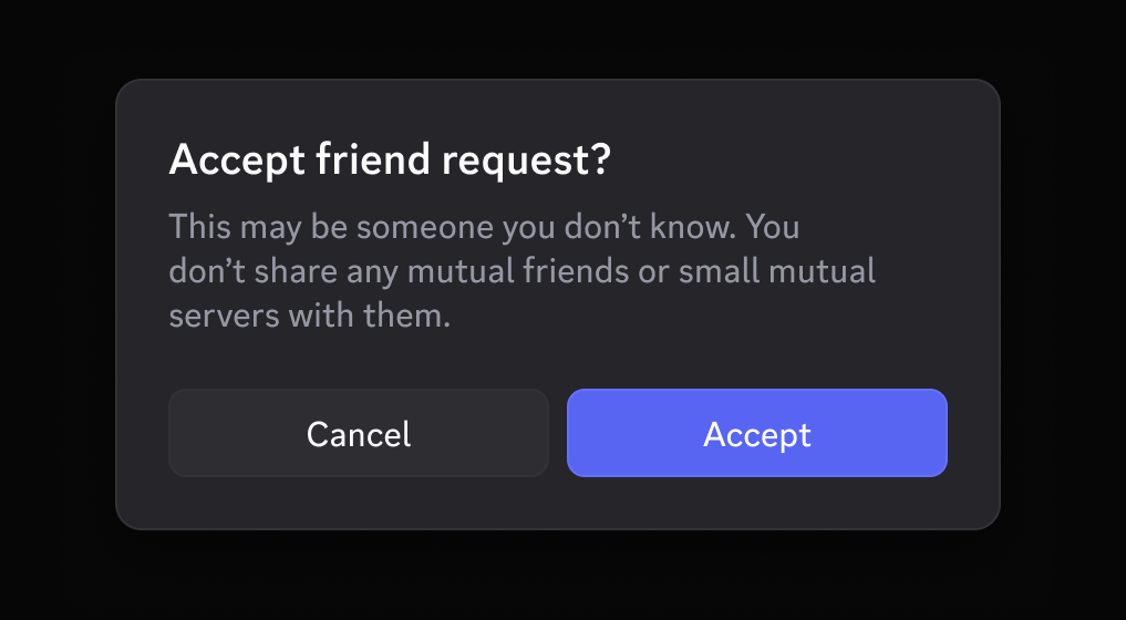- You will be alerted before accepting a friend request from an unfamiliar user. Unfamiliar users are those you do not have any mutual friends or shared small servers (under 200 members) with. These alerts can help you make more informed decisions about new connections. These alerts cannot be turned off at this time.