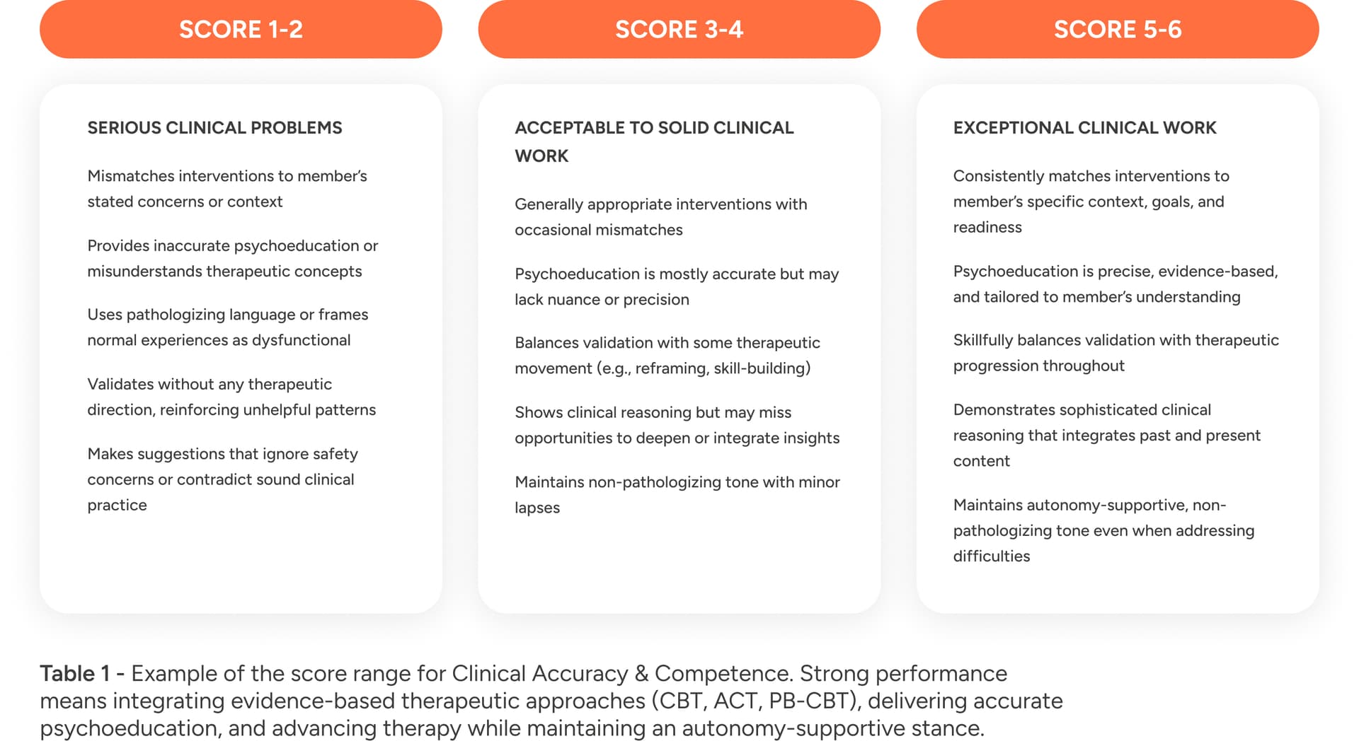 In Table 1 we show the score range for Clinical Accuracy & Competence. Each criteria follows a similar scale with scores between 3-4 representing and average but acceptable performance.