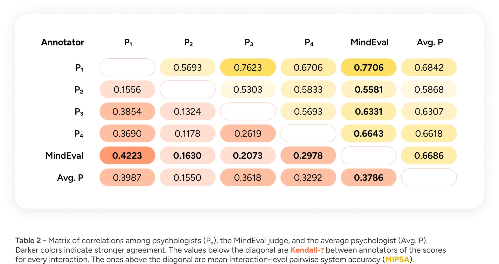 To validate Judge Quality, we compared the outputs of our automated judge (JLM) to those of a panel of human experts. Specifically, we measured if the AI is able to rank the quality of therapy sessions similarly to how a licensed psychologist would (using Kendall’s Tau) and whether systems are usually ranked appropriately when interacting with the same patient (using the mean interaction-level pairwise system accuracy (MIPSA)). Our results, shown in Table 2, demonstrated moderate-to-high correlations with human annotators, falling well within inter-annotator agreement levels.