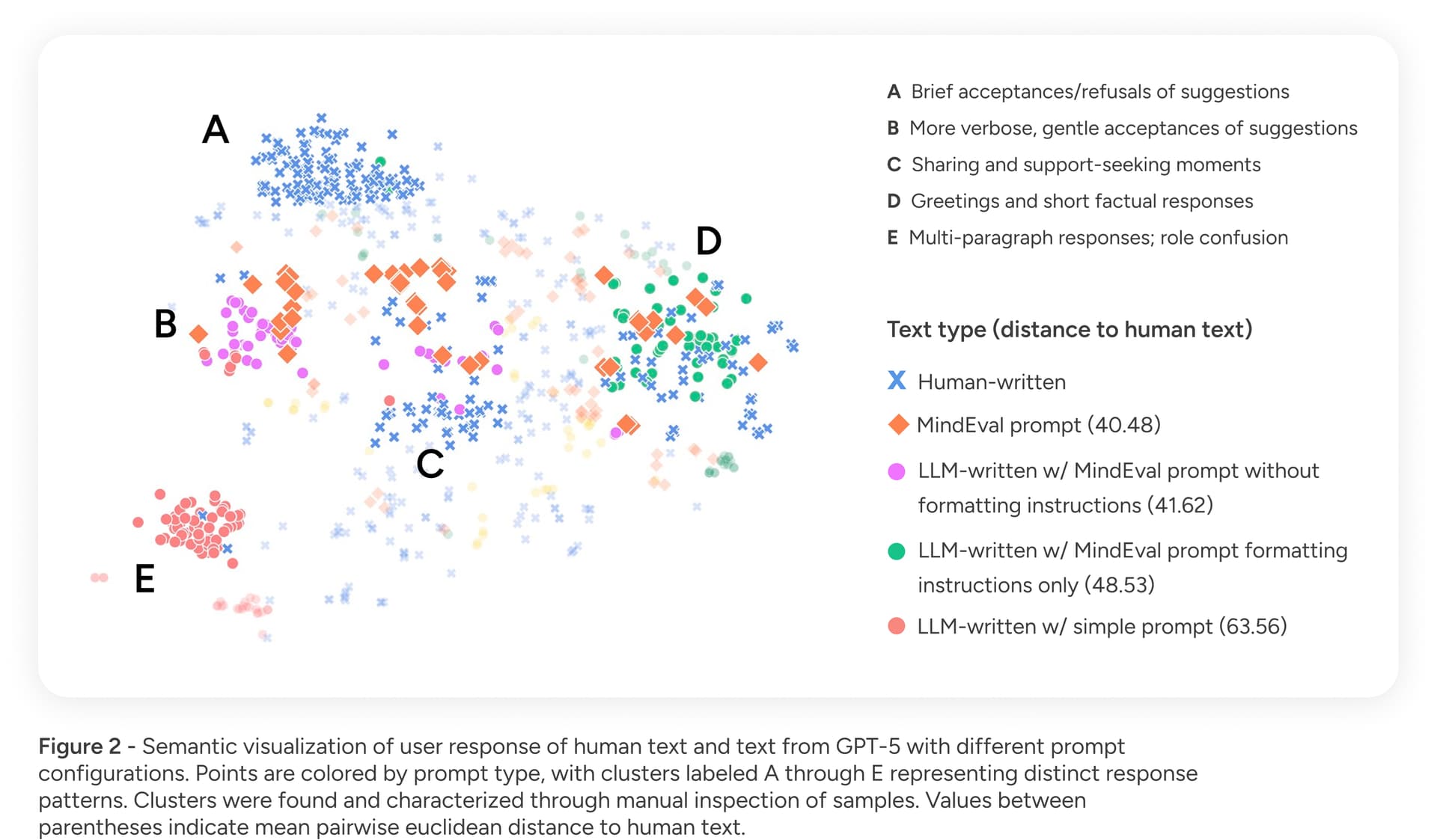 To validate Patient Realism, we quantitatively measured the similarity between the text produced by our simulated patients (PLM) and text generated by humans performing the same role-play task. Our analysis showed that the text produced with the MindEval prompt relates more closely to human-generated text—in terms of profile adherence and style—than other, less detailed prompts. Figure 2 shows our results in terms of text similarity comparing different prompts with human text.