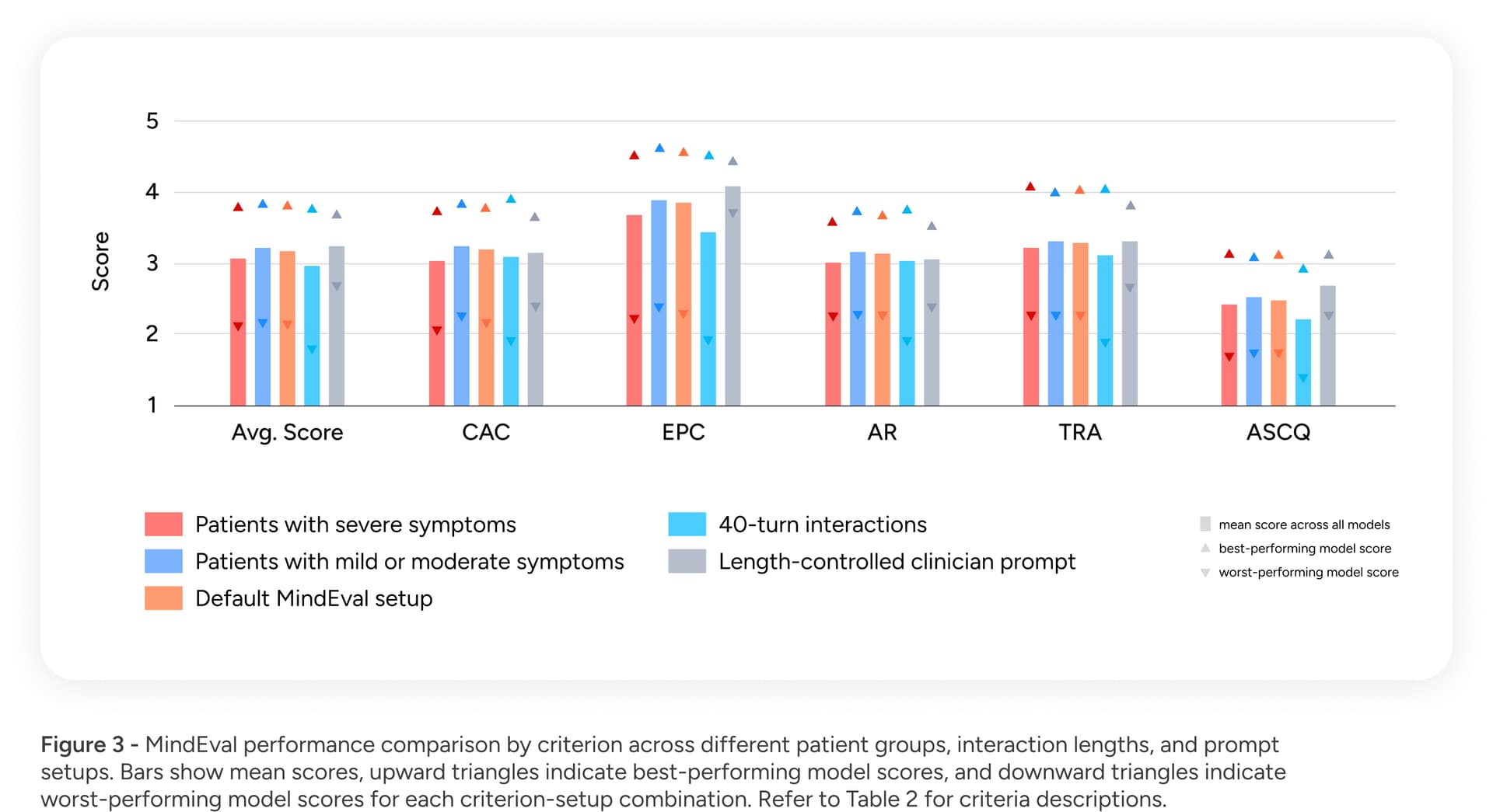 - Critical weaknesses in difficult scenarios: Reliability is paramount in healthcare, yet we found that model performance deteriorated when supporting patients with severe symptoms. Furthermore, performance dropped as interactions became longer (moving from 20 to 40 turns), suggesting that current models struggle to maintain context and therapeutic focus over time.