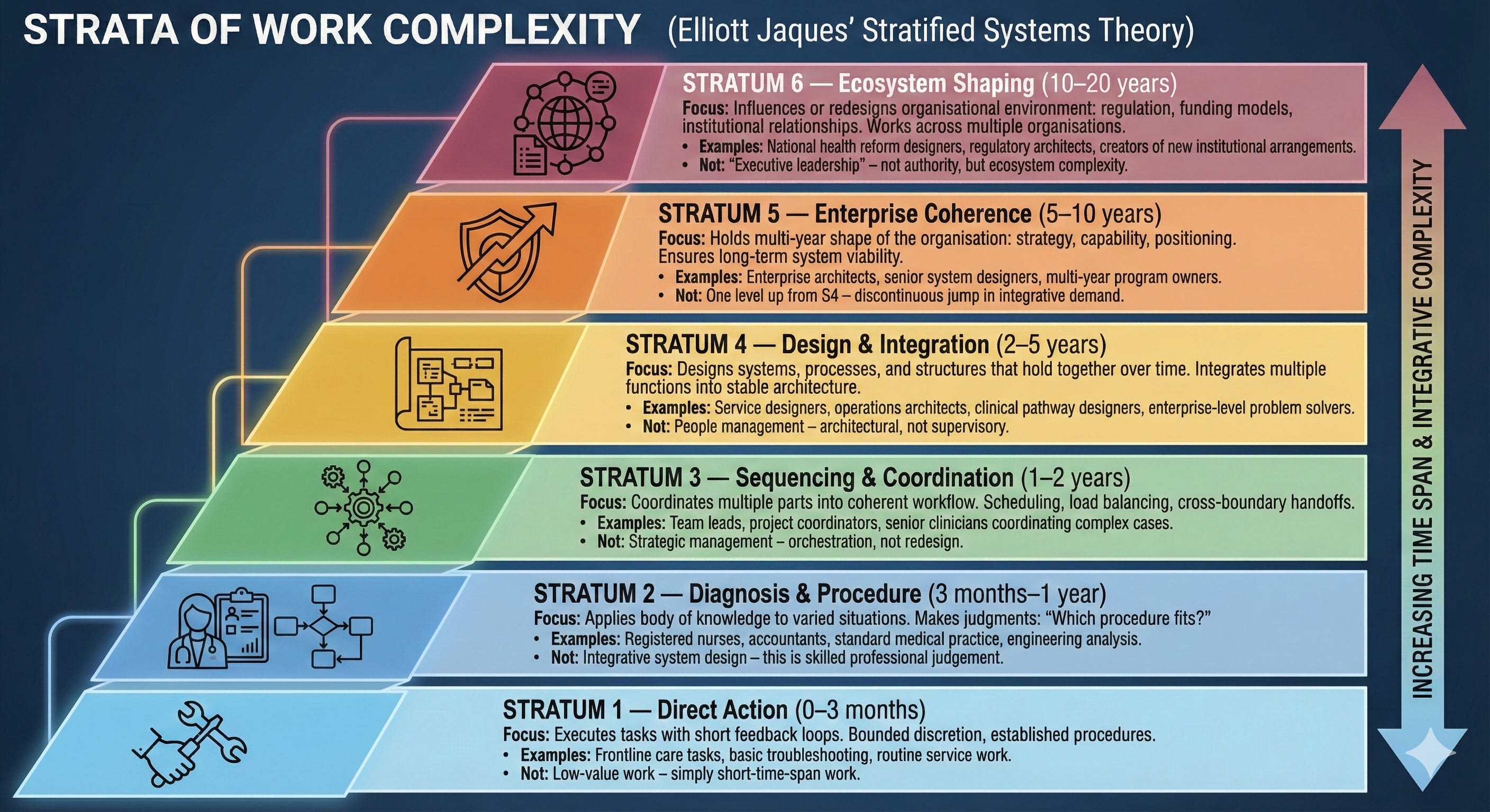 This is why Jaques treated strata as structural categories of work, not personal ranks, they describe the complexity of the judgement required, not the status of the person doing it.