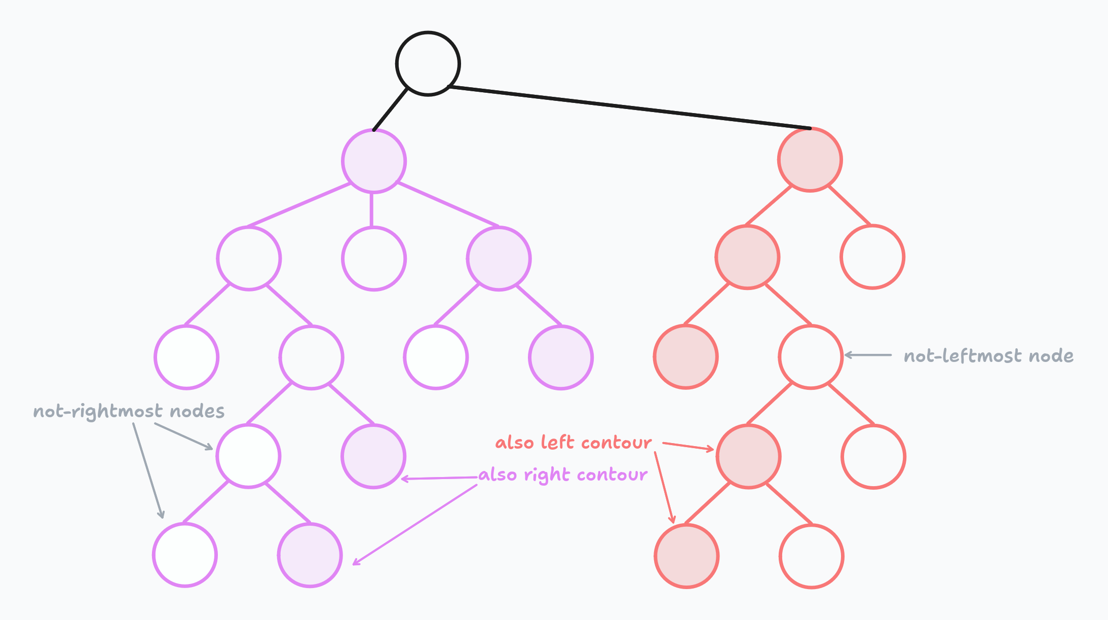 I highlighted the rightmost nodes of the left sub-tree with purple and the leftmost nodes of the current sub-tree with orange. All purple nodes are called the right contour and all orange nodes are called left contour.