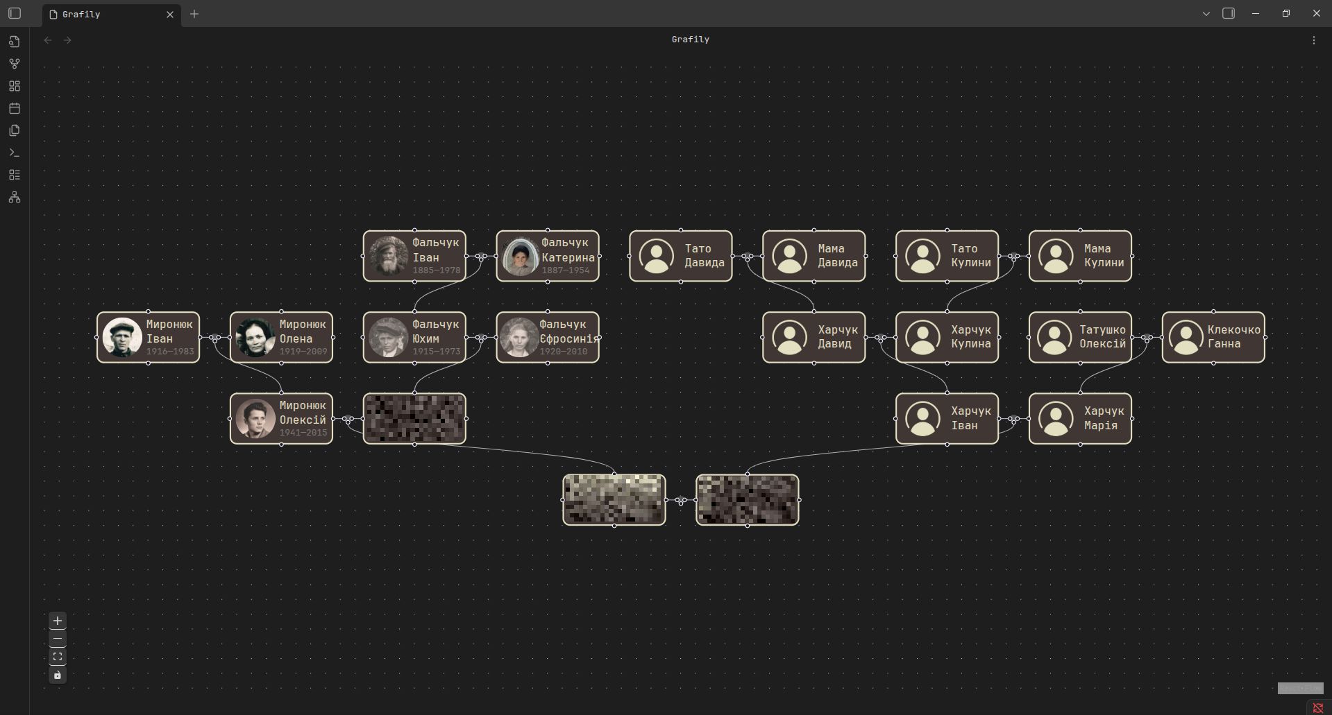 So, where did I stop? Oh, yes, Obsidian. Obviously, I would want to visualize the family graph. The Obsidian has a built-in Graph View. It looks funny, but it doesn't even look close to what I want. I browsed the community plugins and did not find anything helpful. So, I decided to write my own Obsidian plugin that will render family members as a pretty graph. Plugin details are out of the scope of this article. I will definitely write a separate post about it in the future.