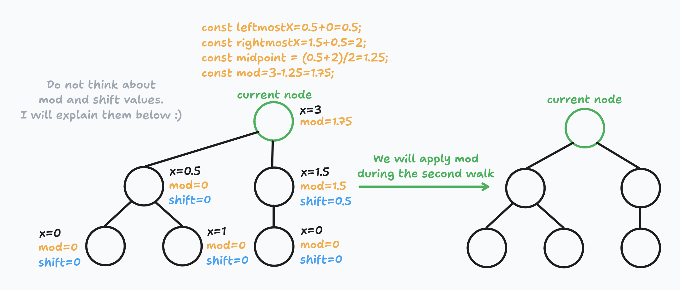 As I wrote above, during the first walk, we determine preX, mod, and shift values for each node in the tree.
