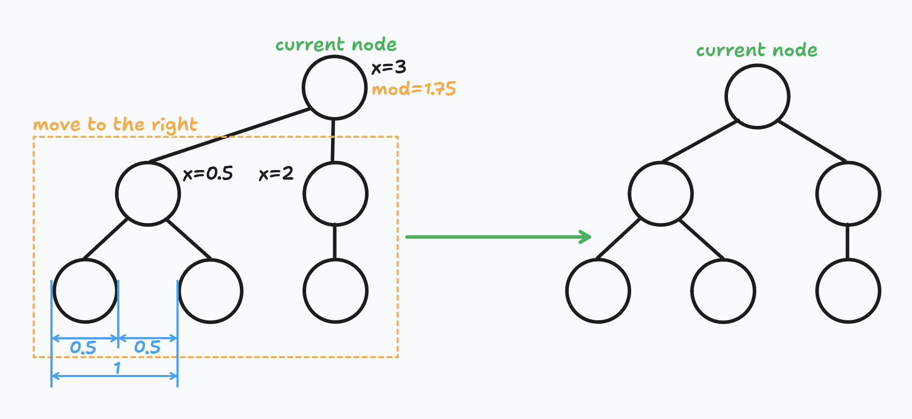 The shift parameter was introduced in this post for better clarity: Reingold Tilford Algorithm Explained With Walkthrough. Sep 12, 2023.