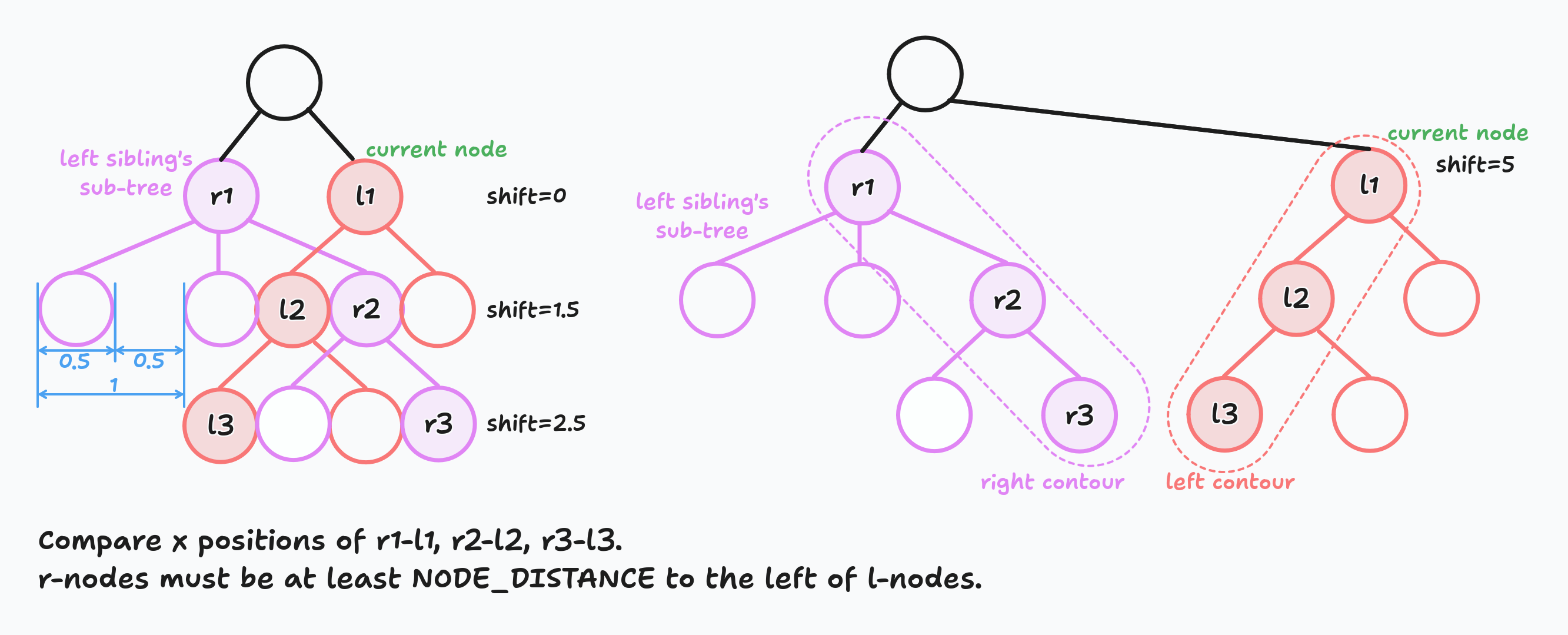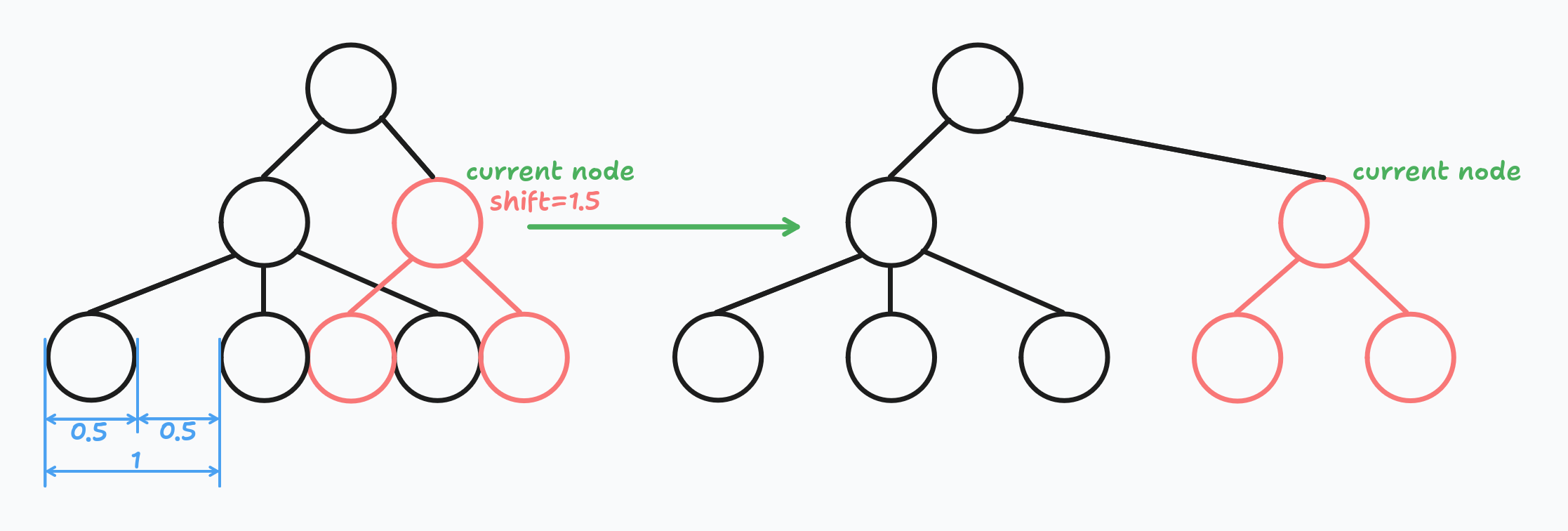 If we detect that nodes overlap, we calculate how much we need to shift the right sub-tree. We do that on each level and, as a result, we take the maximum shift value. The shift calculation algorithm is pretty simple: