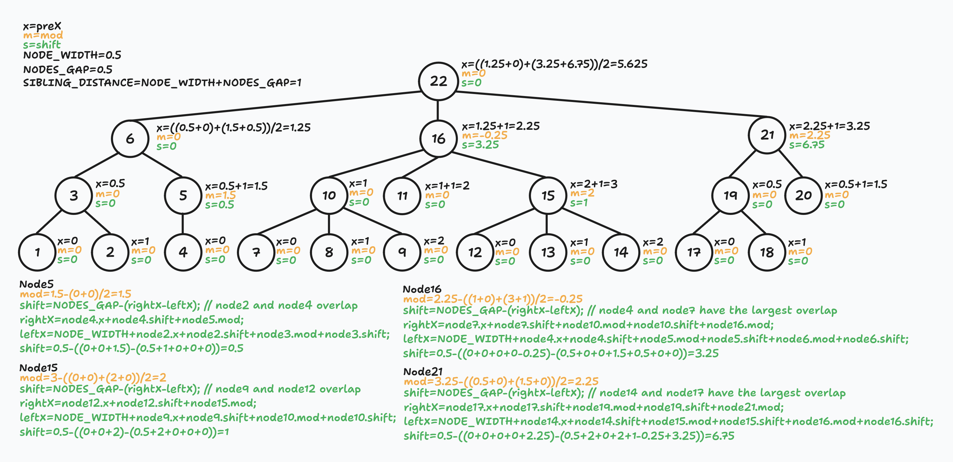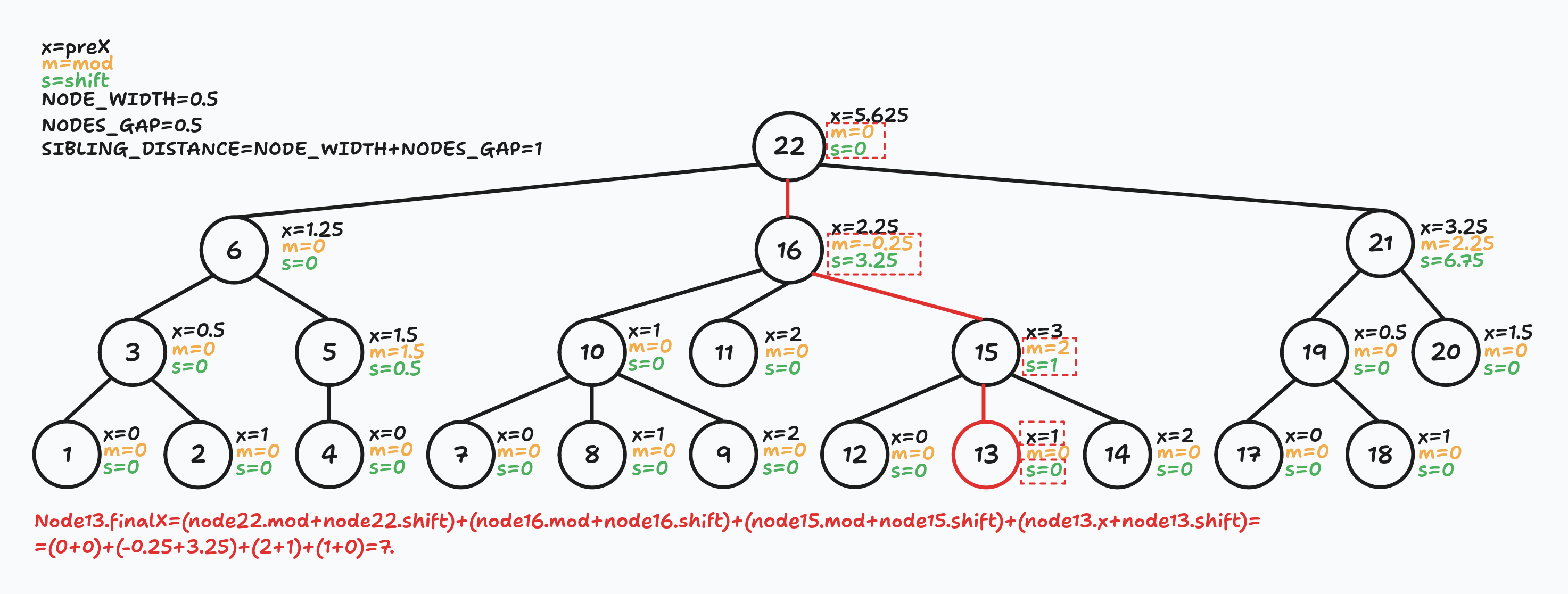 For example, the final x coordinate for node13 is a sum of mod + shift values of nodes22,16,15 and its own x + shift values: