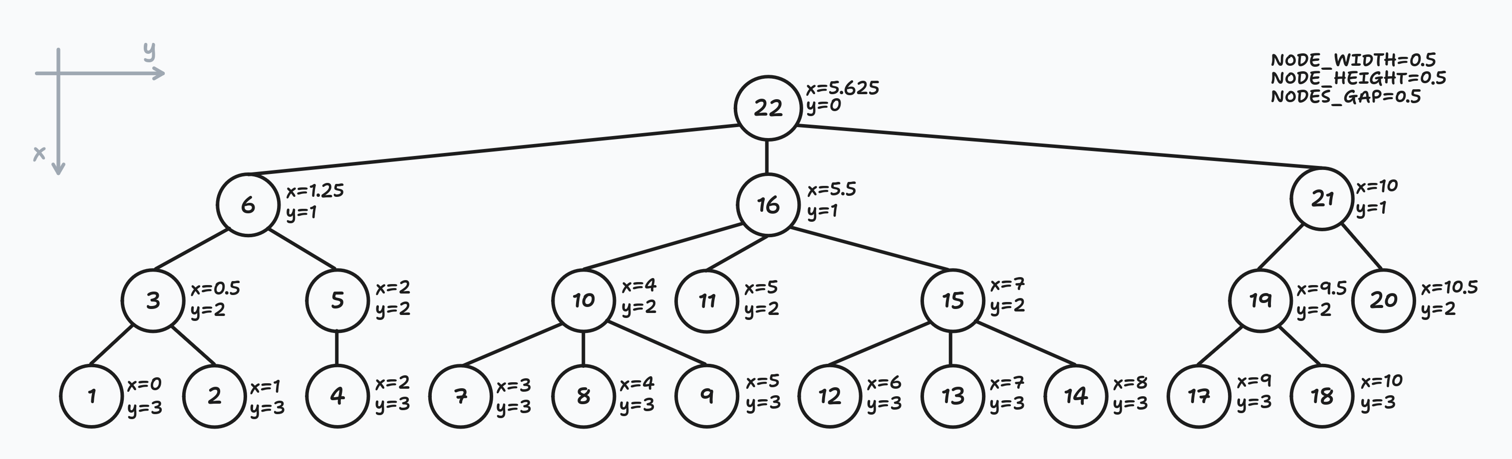 Let's go straight to the point. Our task is to calculate x and y coordinates of each node in our tree.