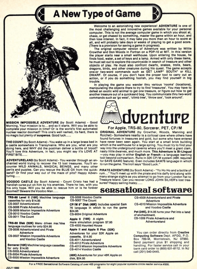 Adams’ local TRS-80 buddies were impressed enough with his game that he decided to sell it through both The TRS-80 Software Exchange and Creative Computing, who offered it on cassette for $24.95 and $14.95, respectively, in their January 1979 magazine issues. He followed up with a whole series of games, starting with Pirate Adventure, and ported the games from the TRS-80 to other popular computer platforms. His wife Alexis joined the venture as a business manager and game designer, co-authoring Mystery Fun House and Voodoo Castle.[12]