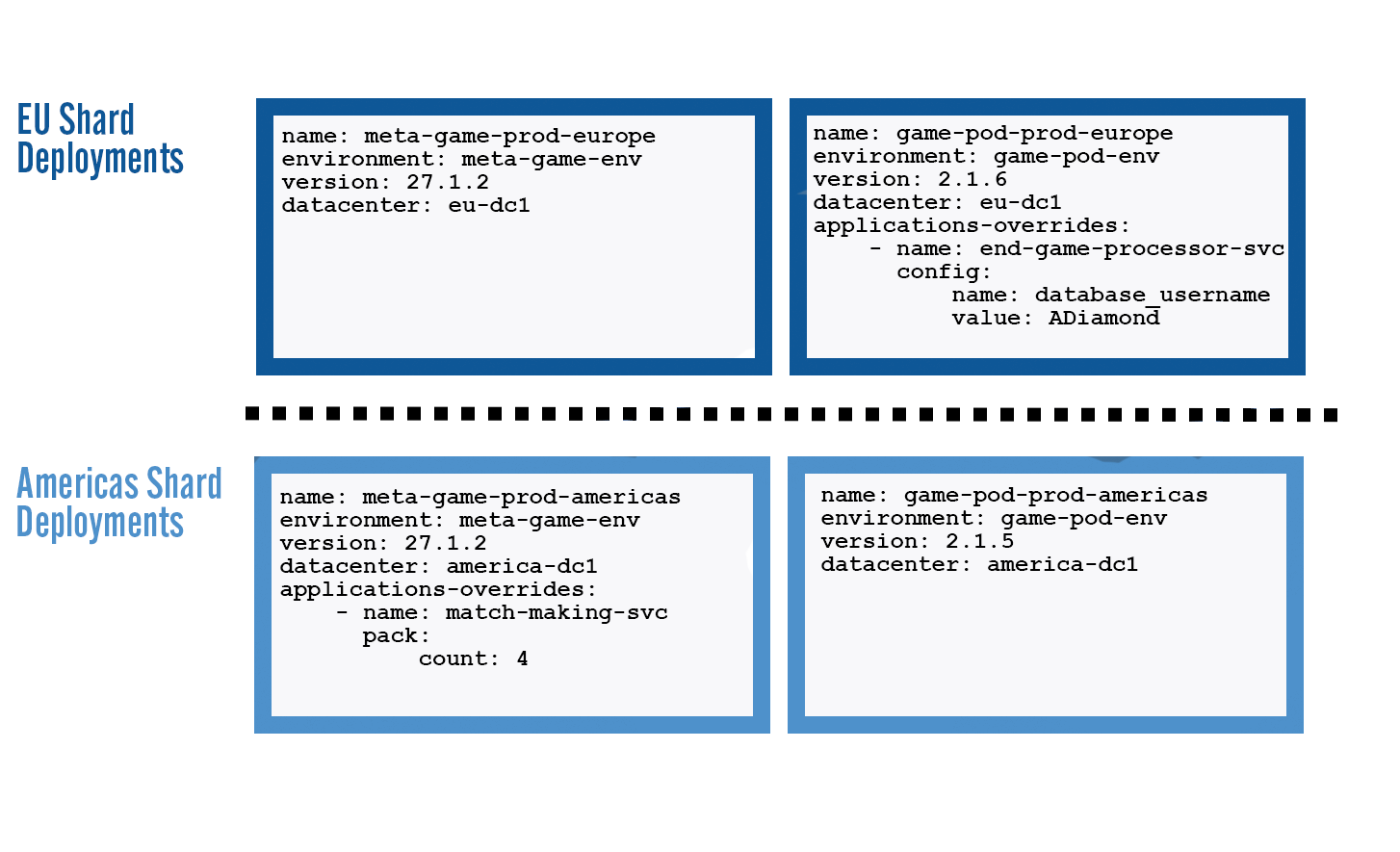 Below we have an example of two hypothetical game shard deployments in two regions. You can see that they’re both comprised of a meta-game environment, and a game-server environment. The game-server-prod environment in the EU shard is trailing the equivalent one in the Americas shard. This provides a common language for game and operation teams to describe and compare different game shard deployments. The simplicity is maintained with the ever-increasing number of services per environment, enabling the deployment of tens of shards reliably.