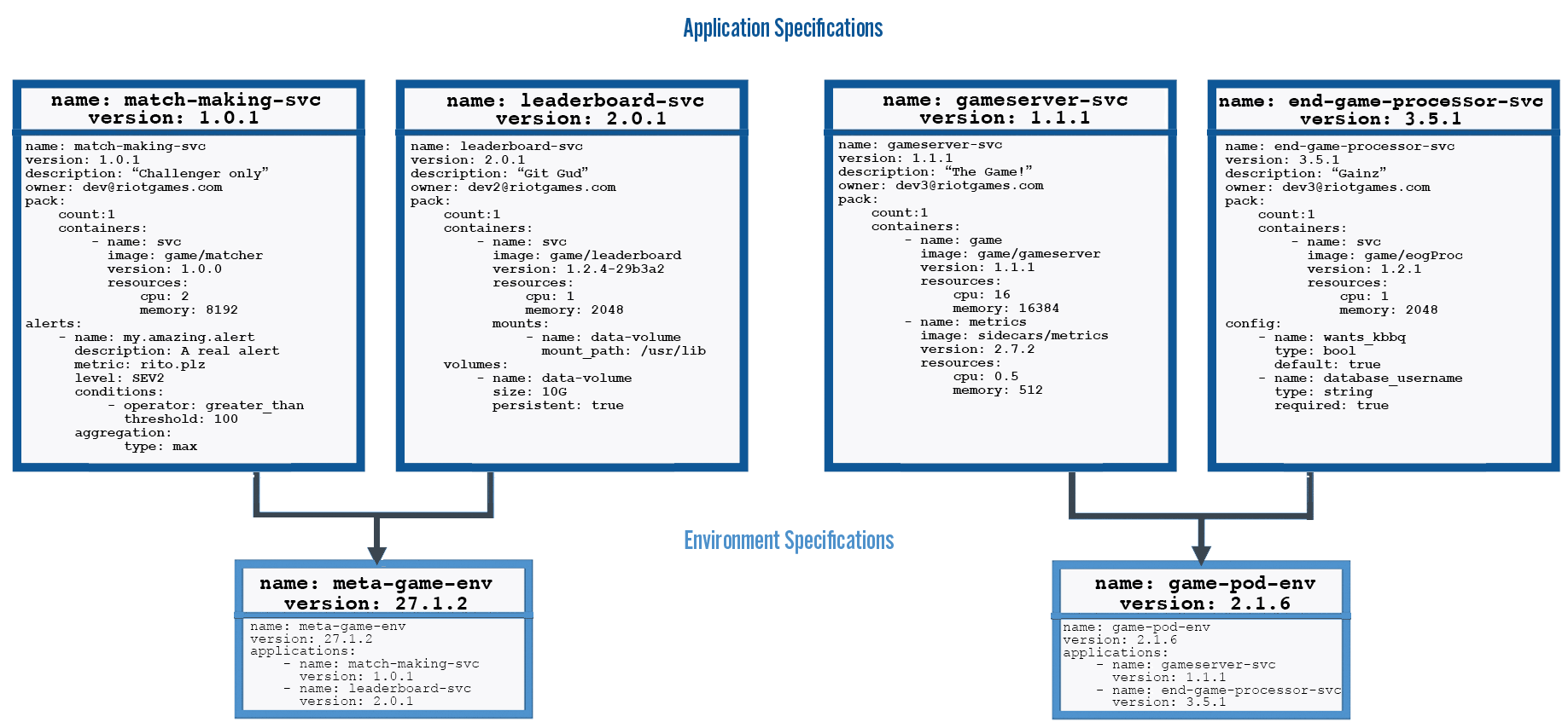 Given that the previous attempts failed to produce the desired outcome, we decided to eliminate partial state manipulation by creating an opinionated declarative specification that captures the entirety of a distributed product - an environment. An environment contains all the declarative metadata required to fully specify, deploy, configure, run, and operate a set of distributed microservices collectively representing a product and is holistically and immutably versioned. For those wondering, we picked “environment” because it was the least overloaded term at Riot. Naming things is hard.