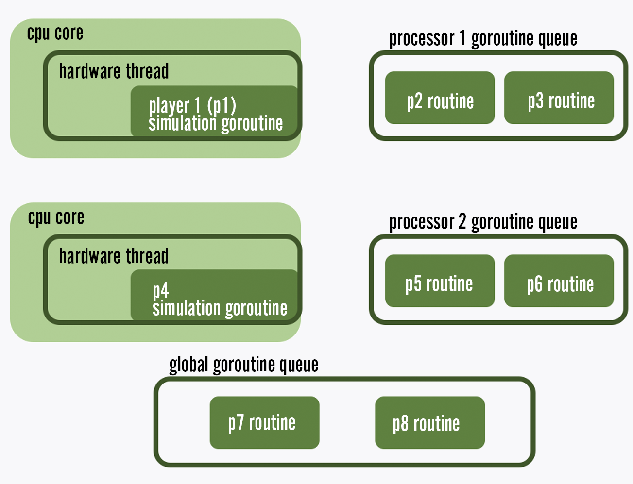 Go's scheduler distributes lightweight routines across a smaller number of hardware threads to reduce overhead
