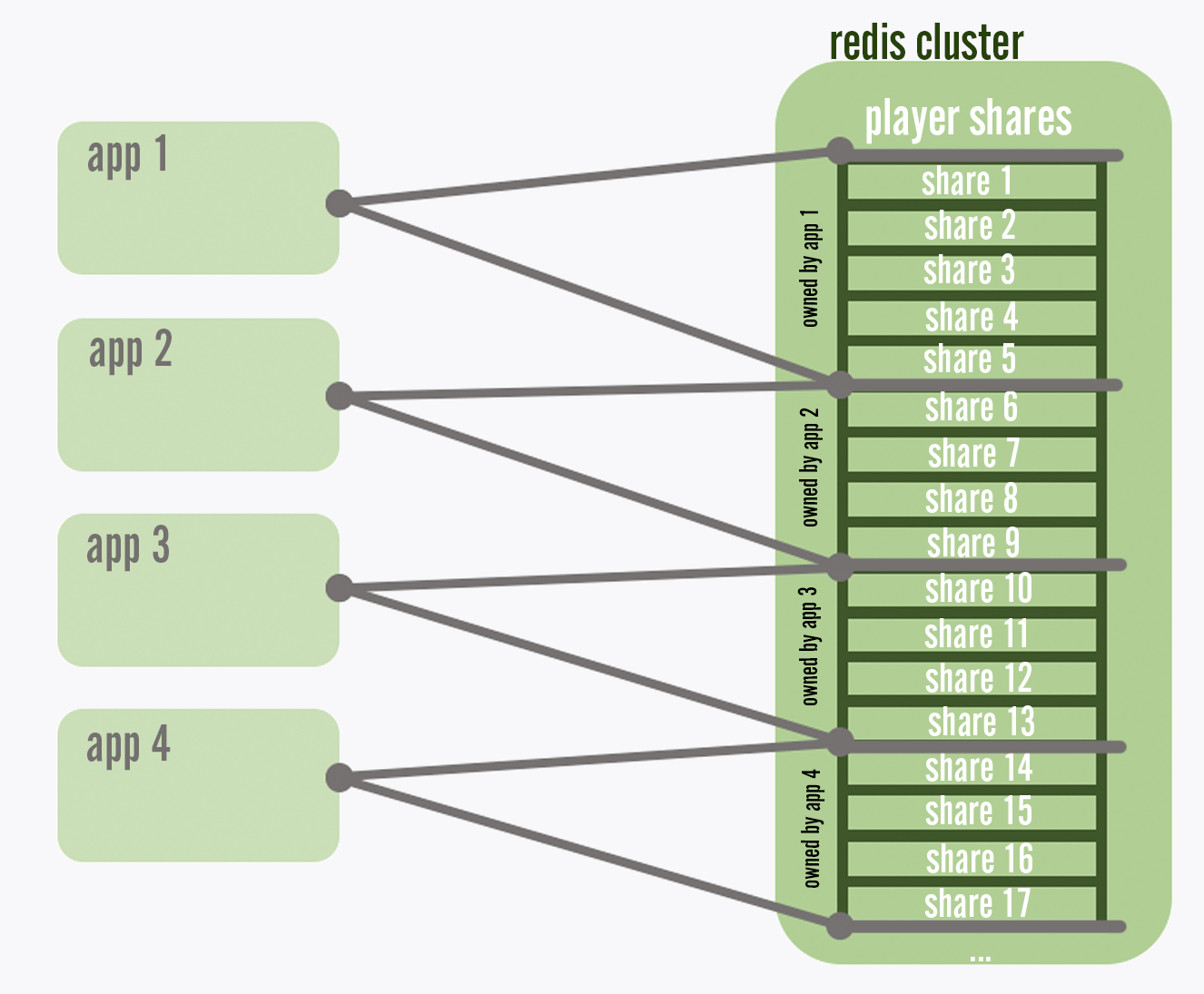 One challenge, though, is how to handle player processing that doesn’t originate from an explicit request from a client. As an example, our session service needs to change a player’s state to offline if that player suddenly stopped sending heartbeats without explicitly disconnecting, perhaps because they crashed or lost power. Which session service instance should measure the duration of non-responsiveness for each player and change their state to offline when that duration reaches a threshold? We answer this by assigning players into one of 256 shares based on the modulo of their player ID hash. We store a list of the 256 shares in a Redis shared memory cache. As services start up, they will check this list, and claim a portion of the shares by registering their own instance ID in the list. When new service instances are deployed to further spread out load, the new instances will steal shares from existing instances until each instance owns a roughly equal number of shares. Each service will then handle the background processing for all the players in the shares that it owns.