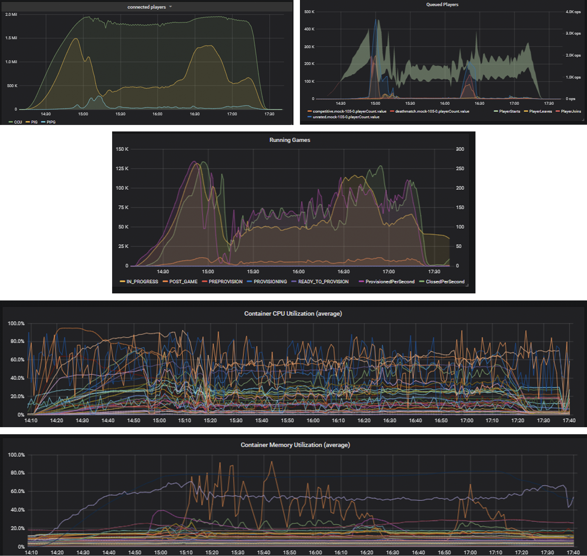 A portion of our dashboards showing the results of a successful two million player, three hour load test