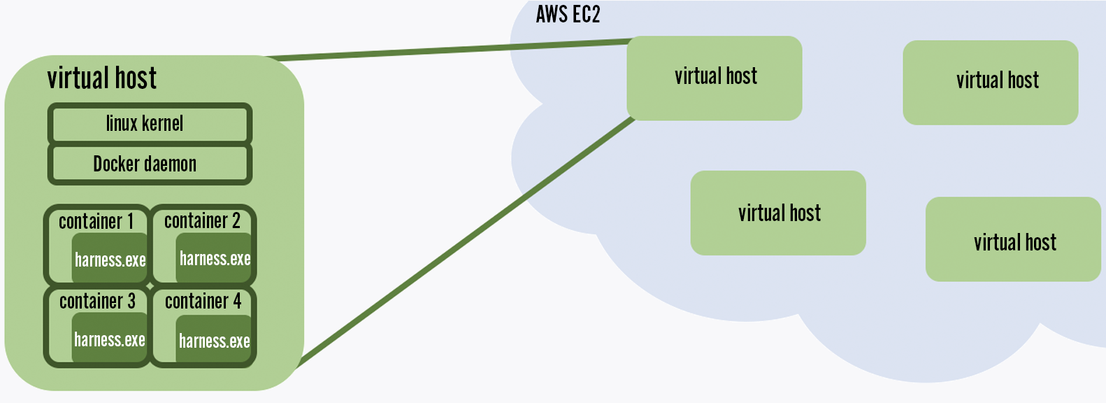 Our load test environment uses Amazon AWS, Riot Container Engine, and Docker to deploy a large number of load test harness processes into the cloud