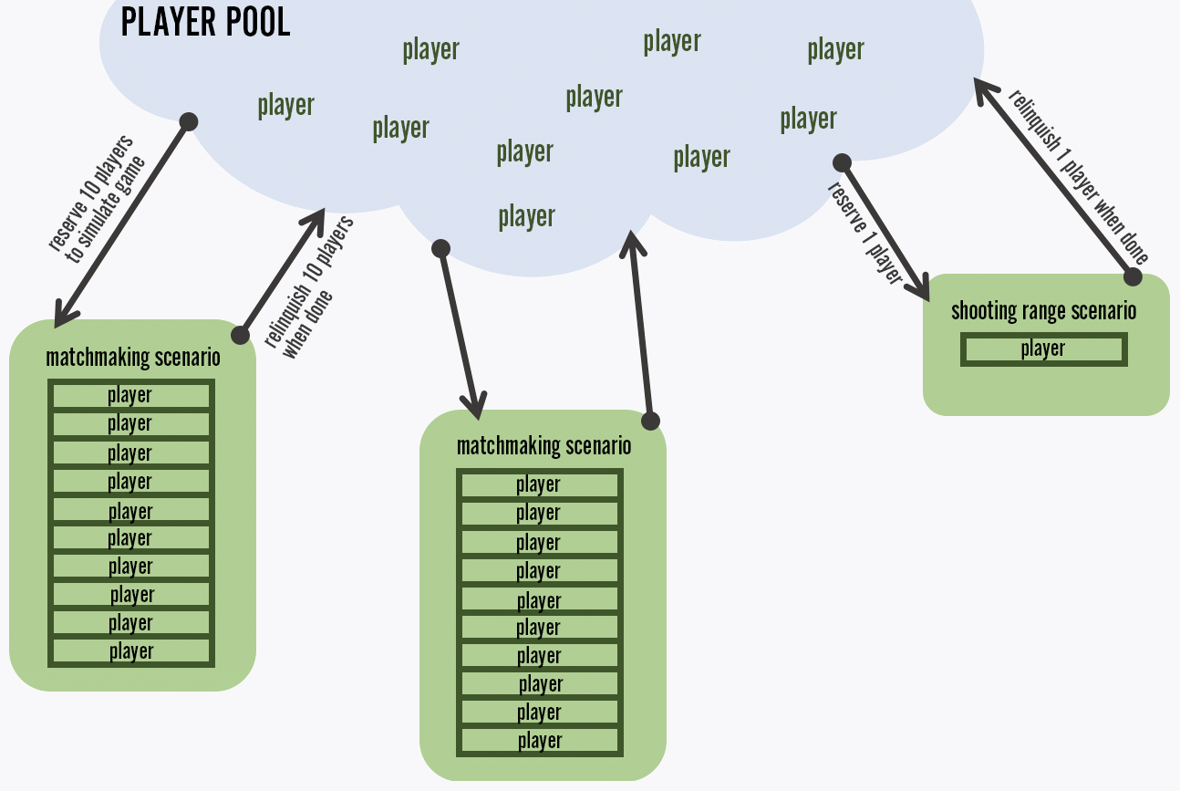 Each concurrently running scenario reserves a number of players from the pool depending on the scenario type and configuration