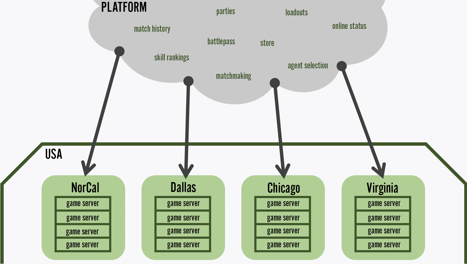 Two key pieces of VALORANT’s infrastructure allow us to support a large number of players - the game server executable and the platform.