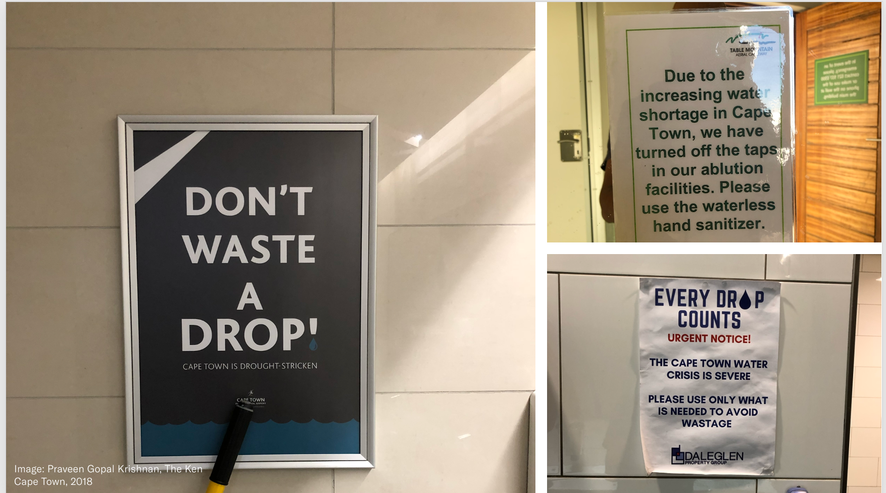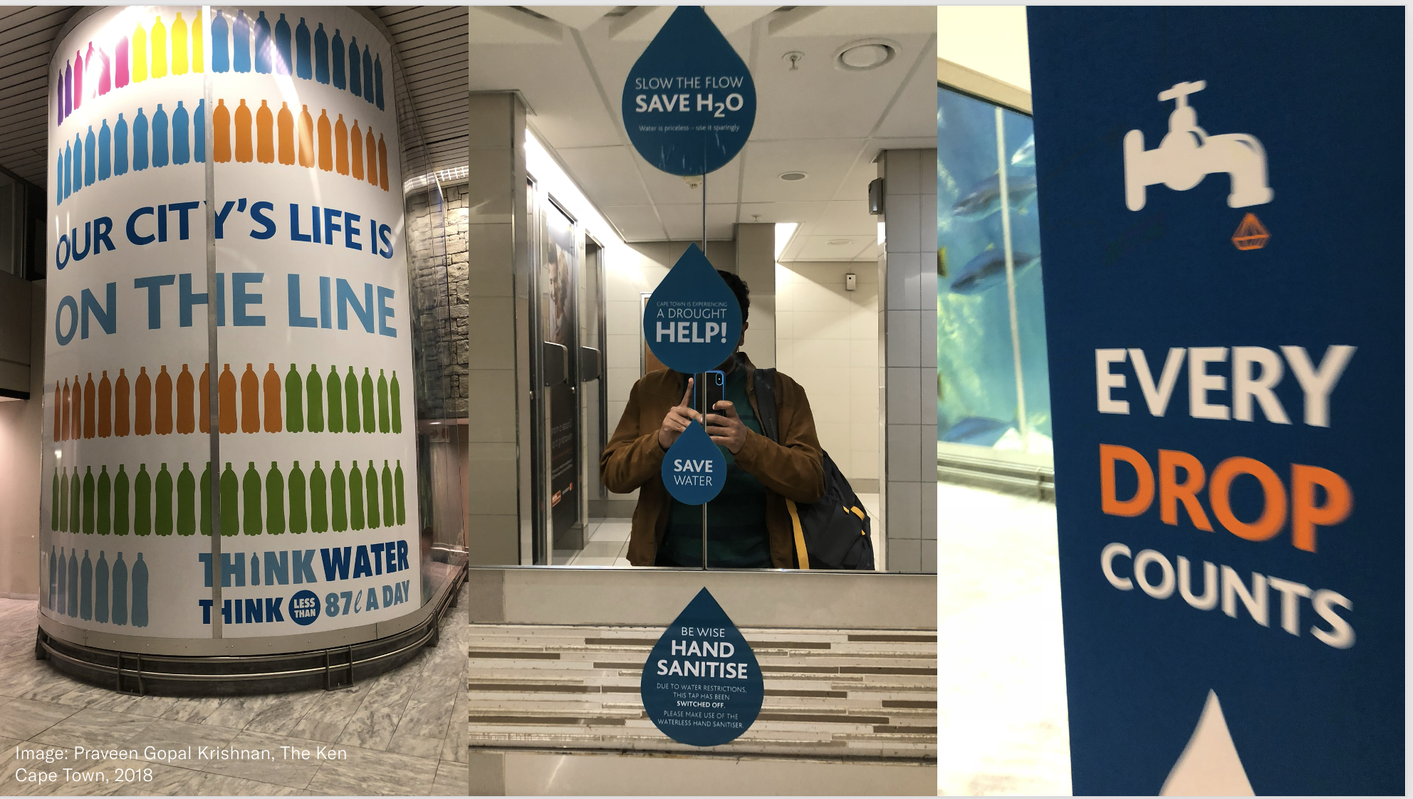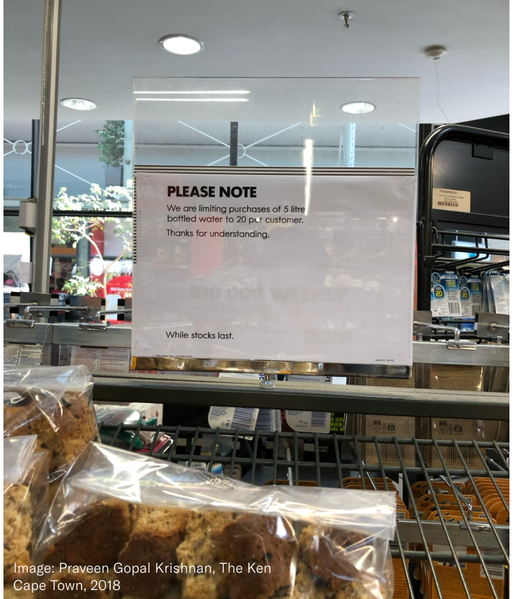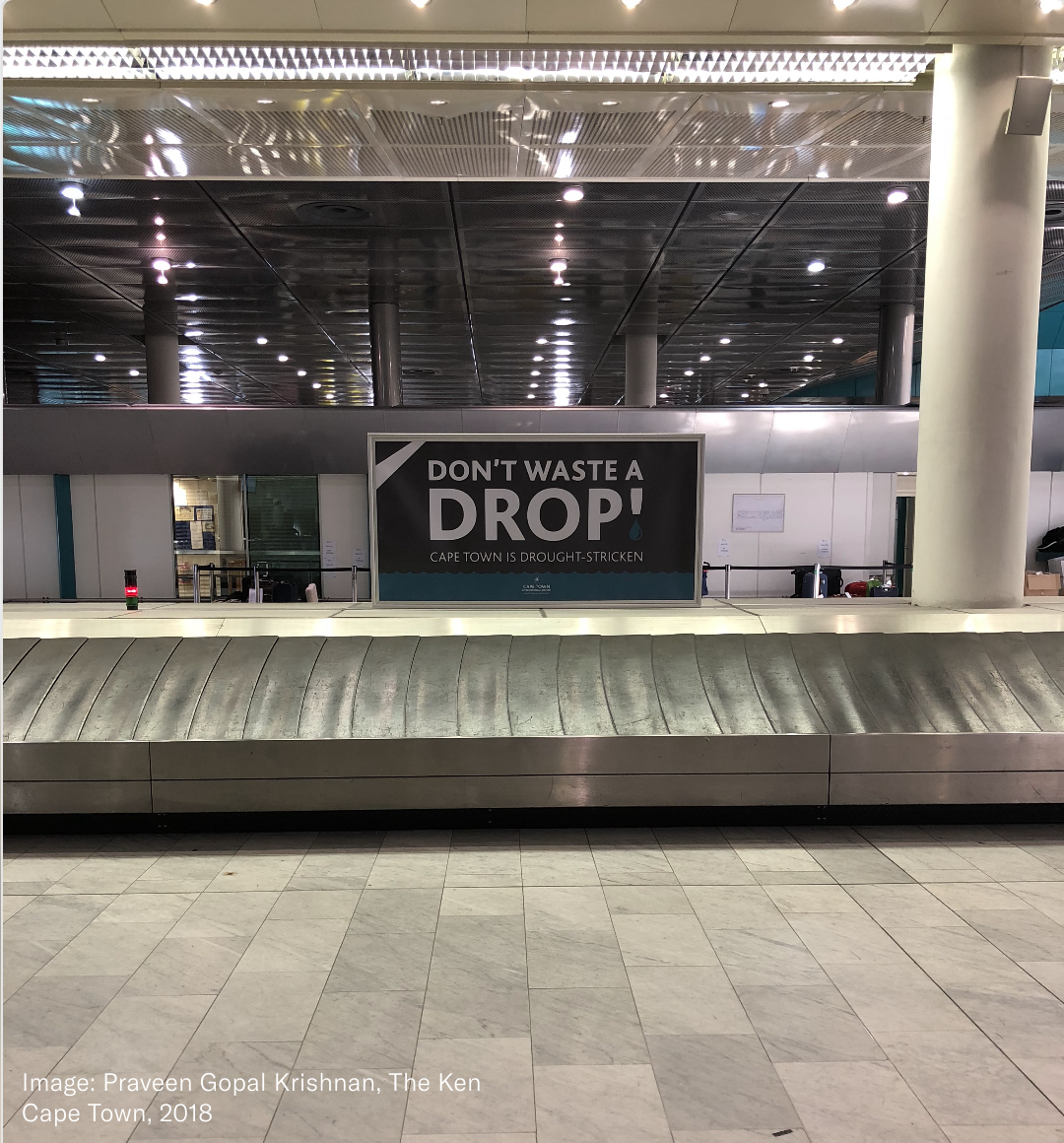 The city was facing a drought that it hadn’t experienced in almost four centuries. In January, which was when I landed in Cape Town and had that airport experience I just described, the government had just announced a countdown to “Day Zero”—the day when they would turn off the municipal water supply across the city and ask four million people to stand in queues everyday at certain specific taps to collect limited rations of water. Armed guards were expected to be called in to watch over the taps, and to stop fights and violence.