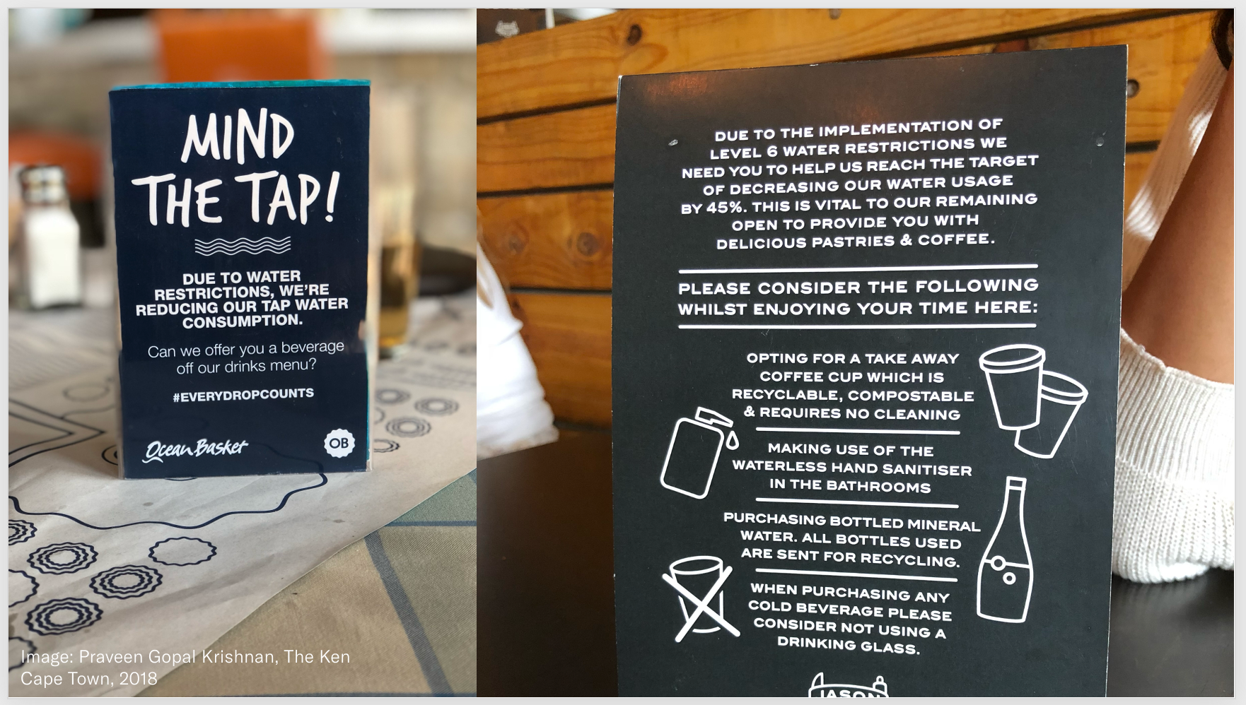 This crisis didn’t happen overnight. Cape Town’s water crisis had escalated over several months, and the city government tried several things to address it. They tried to procure water from other regions. They tried to build desalination plants quickly. They also implemented civic water restrictions slowly, over months, and assigned levels to it depending on the severity. In late 2016, they set it to Level 2—which restricted garden watering to thrice a week for a maximum of an hour a day. In June 2017, they raised it to Level 4—which limited water usage to 100 litres per person per day. By September, this had gone up to Level 5—which banned outdoor and non-essential use of water.