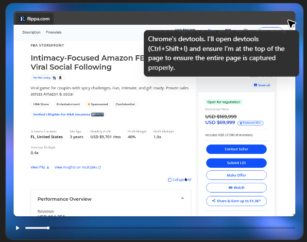 ChatGPT Agent Mode did a great job with the Flippa task aside from the screenshot, though it was not especially quick. The lack of access to Amazon makes it a non-starter for me, but hopefully OpenAI and Amazon work something out there.